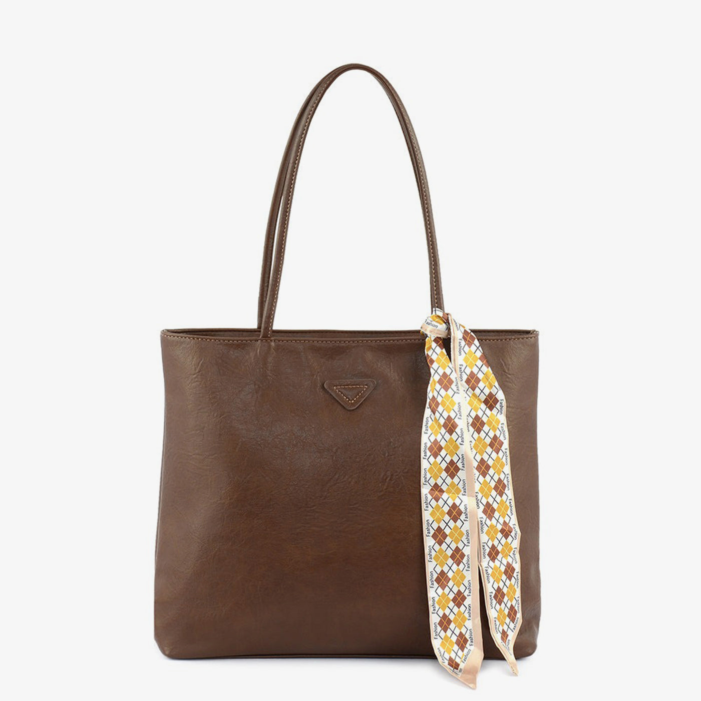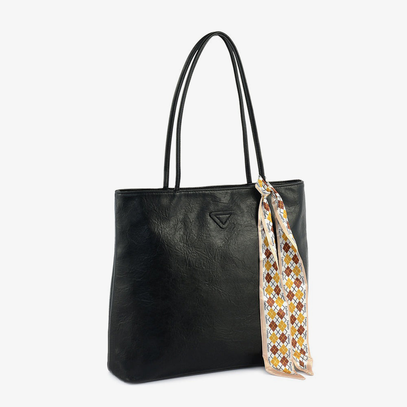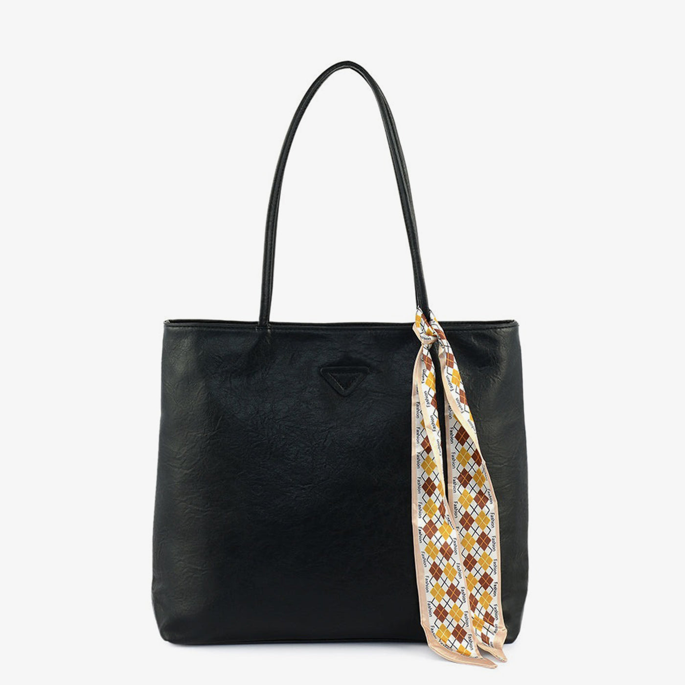 Carry your everyday essentials with a touch of elegance in this classic black tote bag, adorned with a stylish patterned scarf tied to the handle. A versatile and sophisticated...