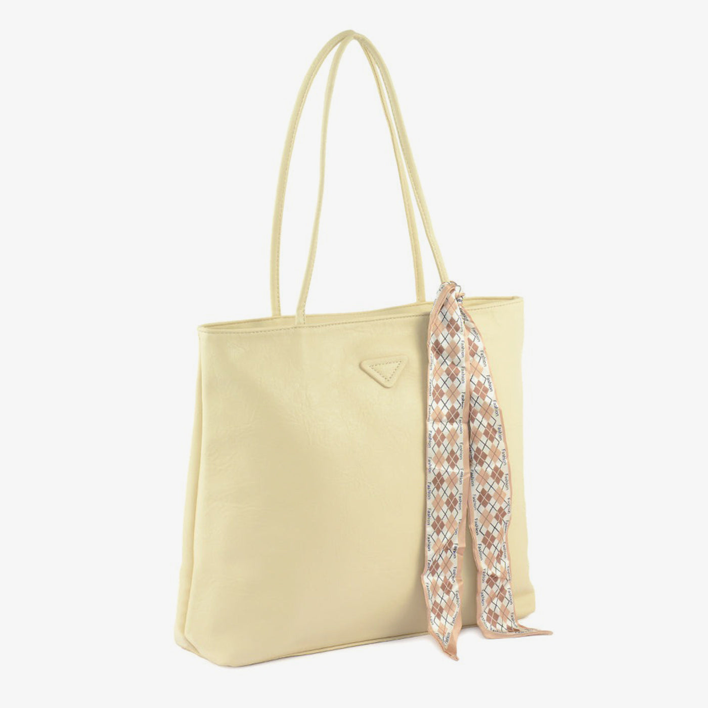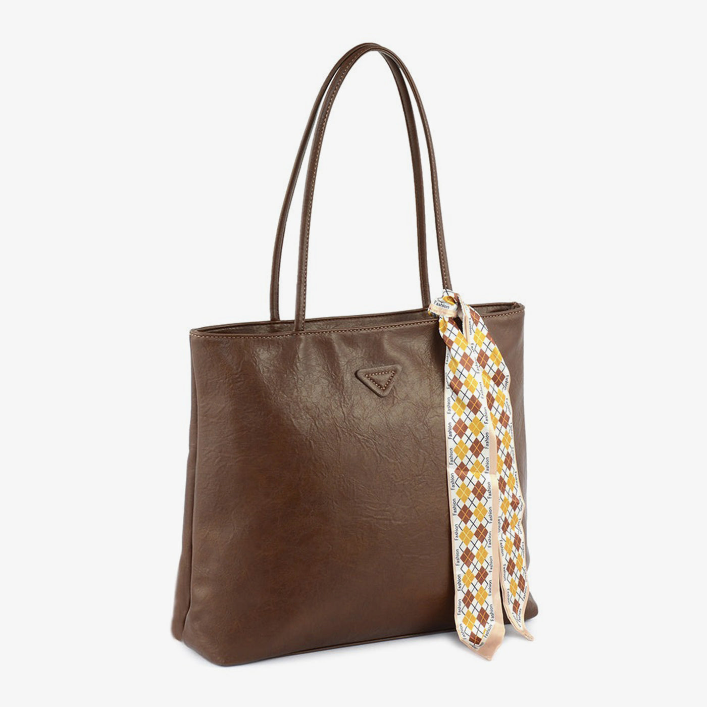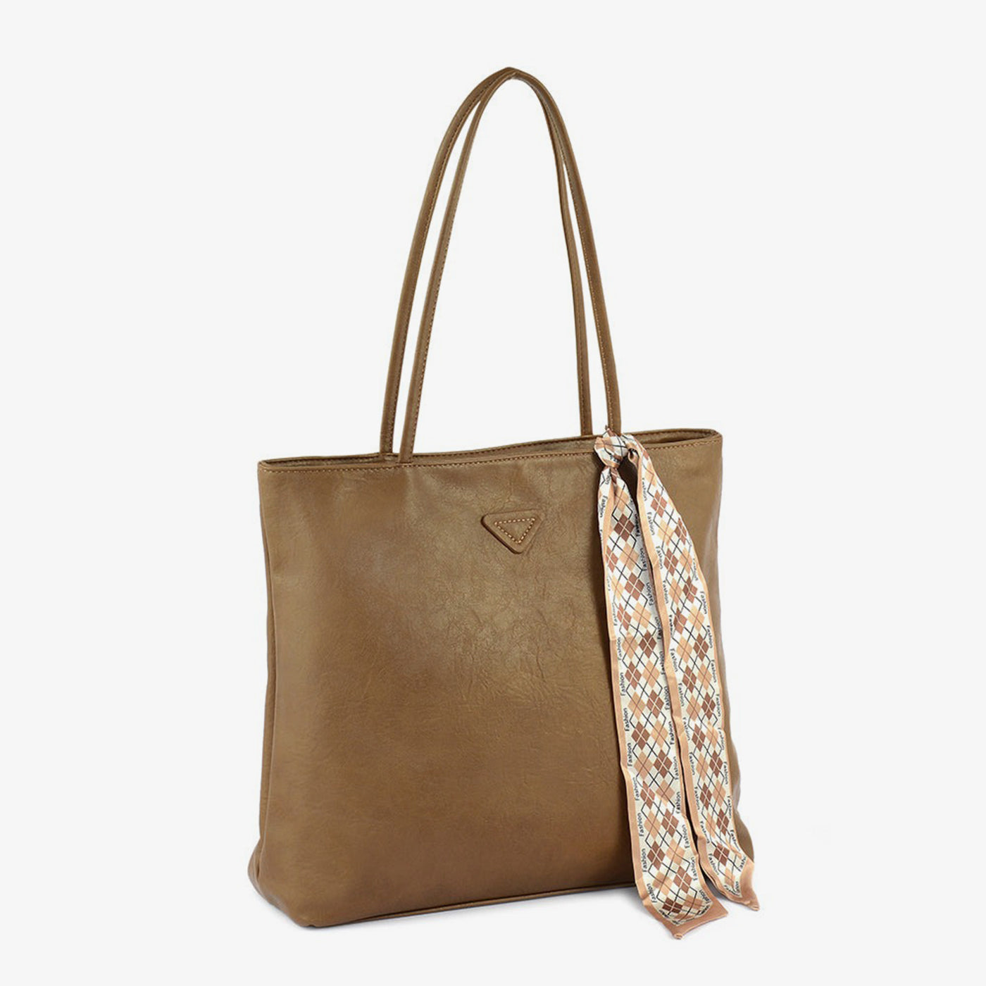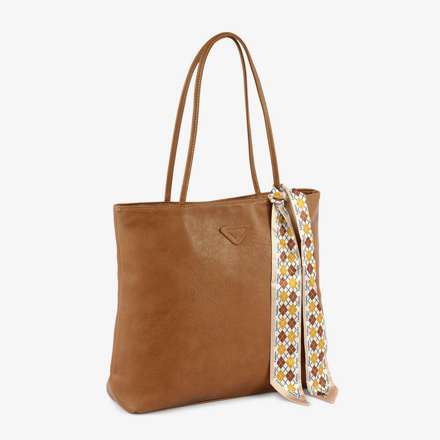 Carry your everyday essentials with a touch of elegance in this classic black tote bag, adorned with a stylish patterned scarf tied to the handle. A versatile and sophisticated choice for your daily life in Lahore.