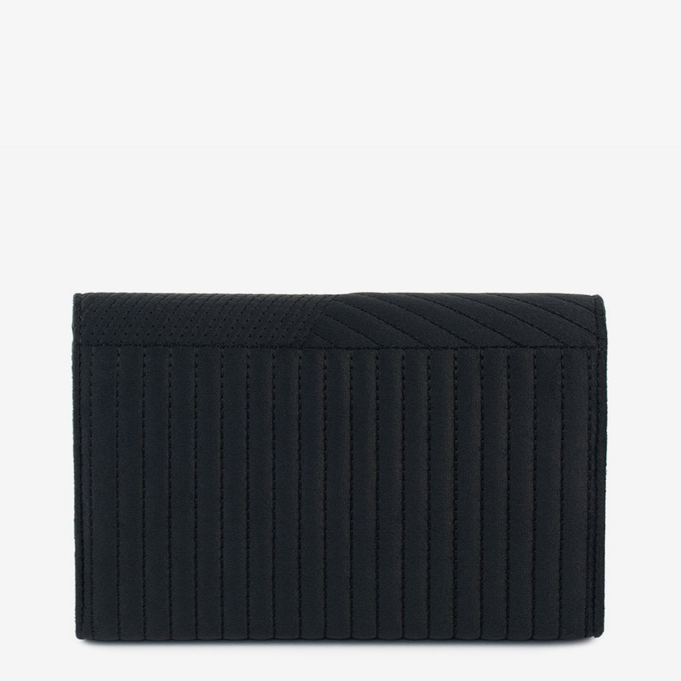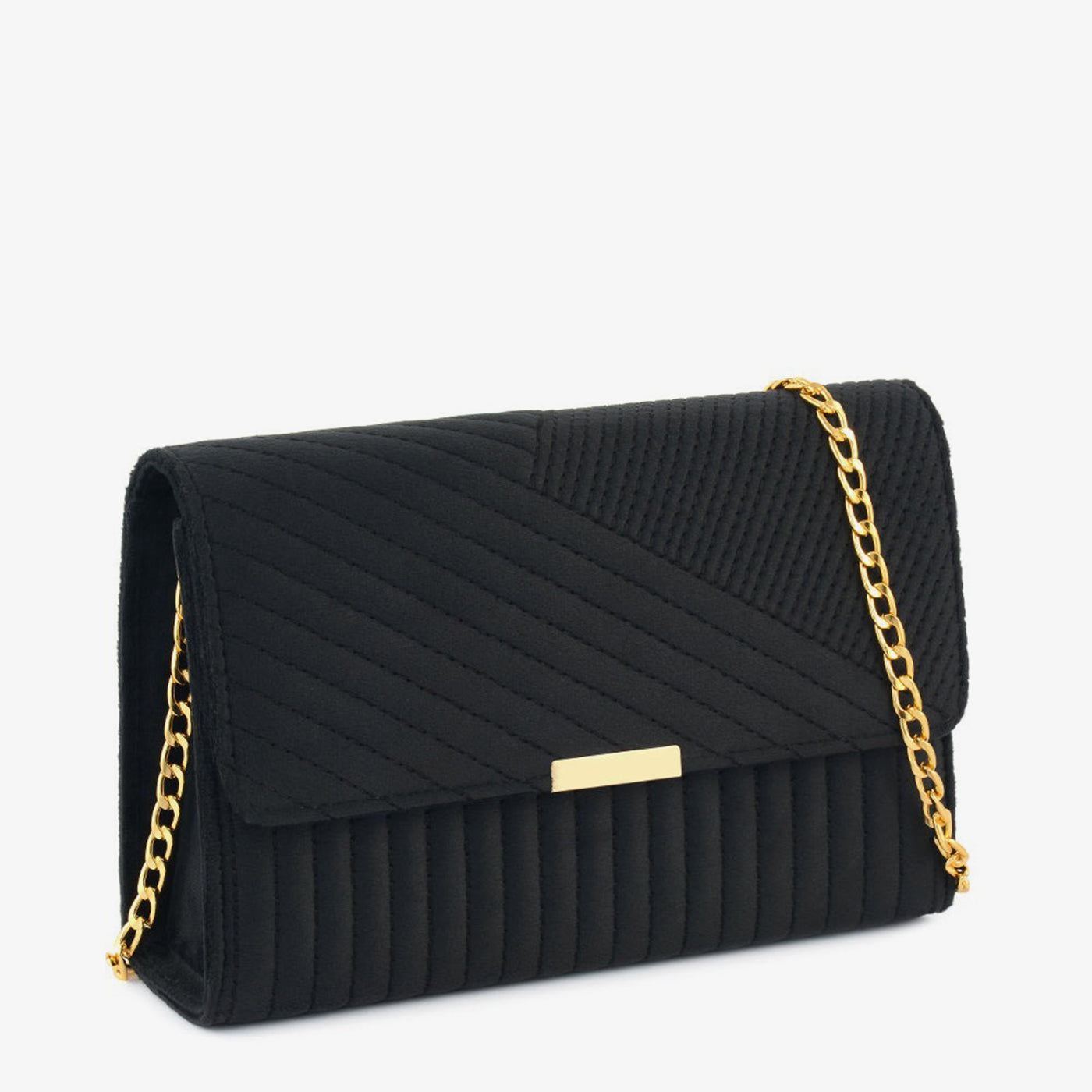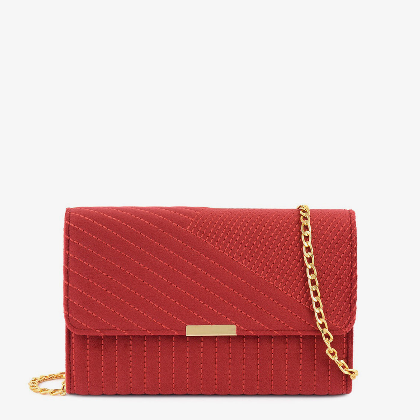 ...A rectangular bag with a flap closure and distinct panelled sections featuring different linear patterns. It is accented with a horizontal metallic bar and a chain strap for carrying.