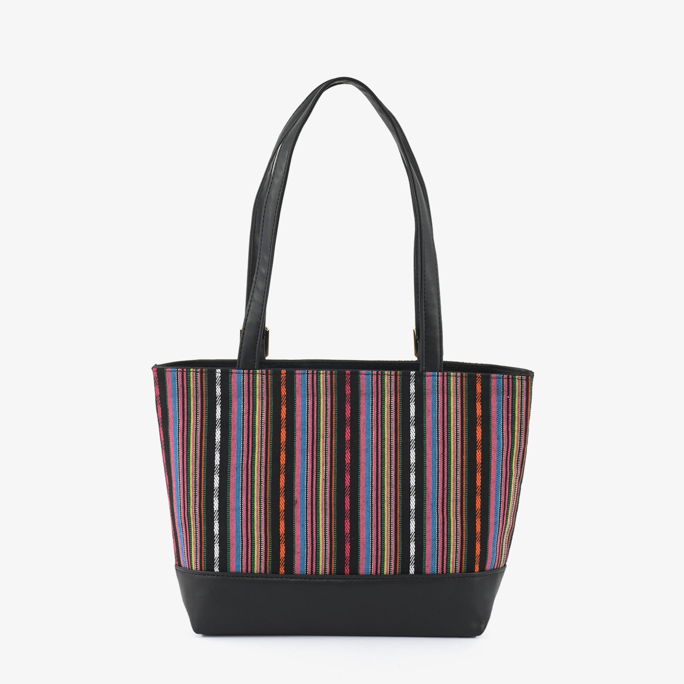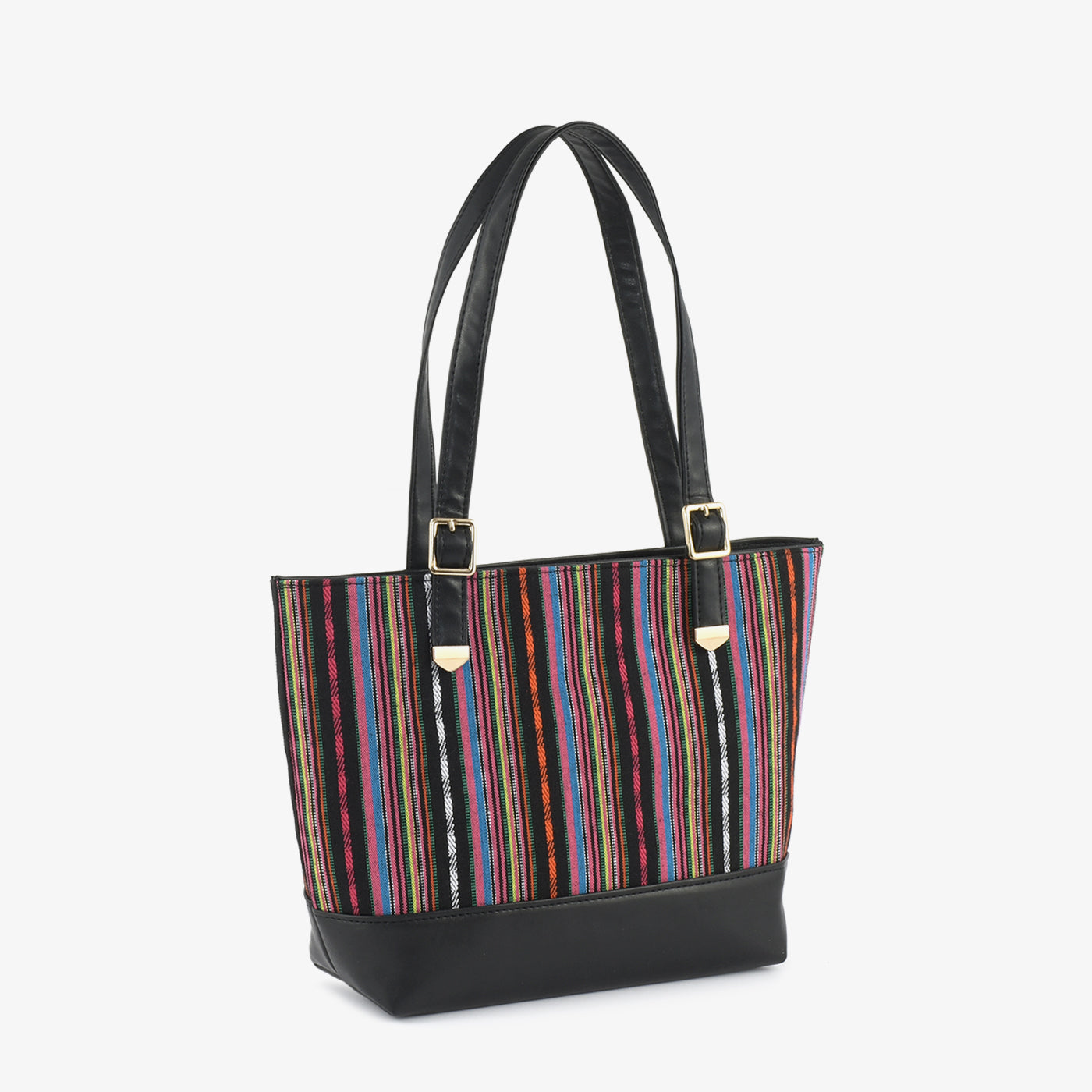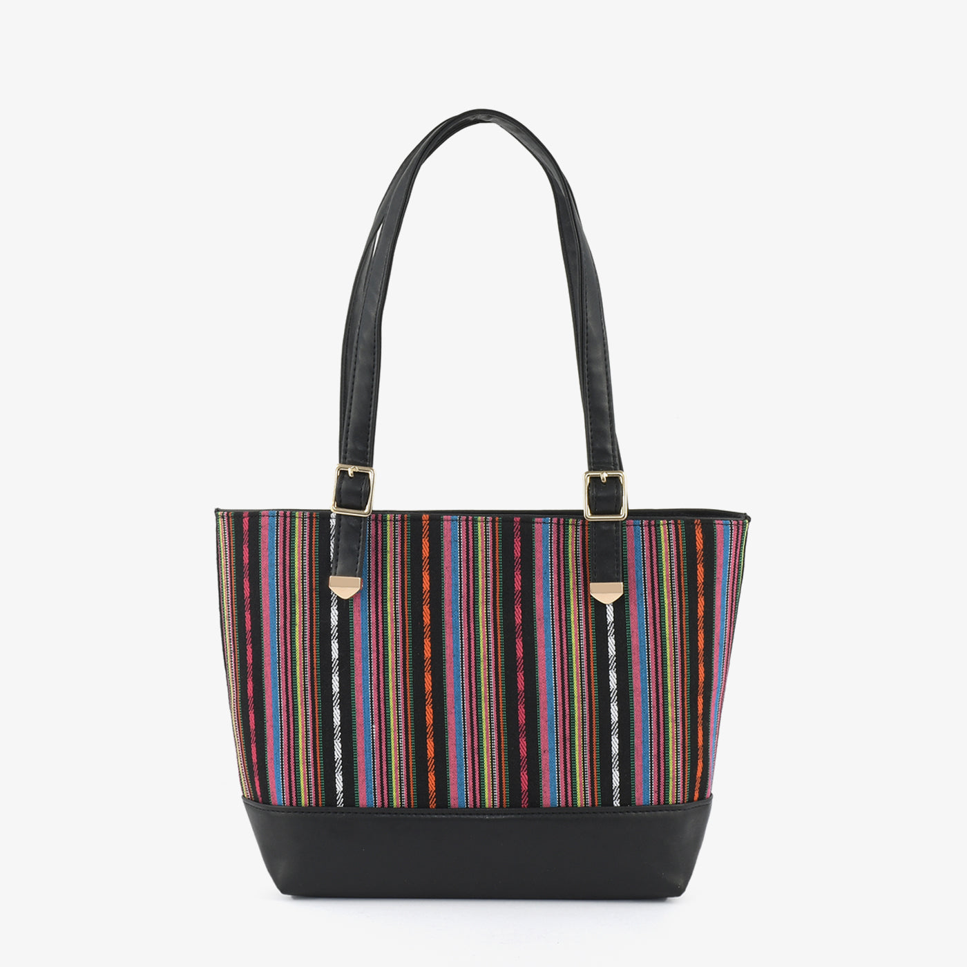 Step into colorful style with this tote bag. It features a vibrant striped pattern on the main body, complemented by a solid lower section and two sturdy top handles....
