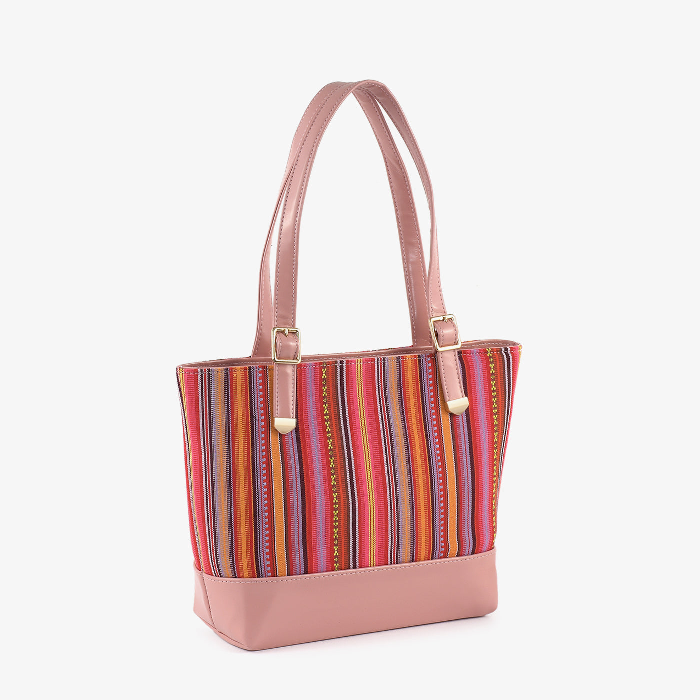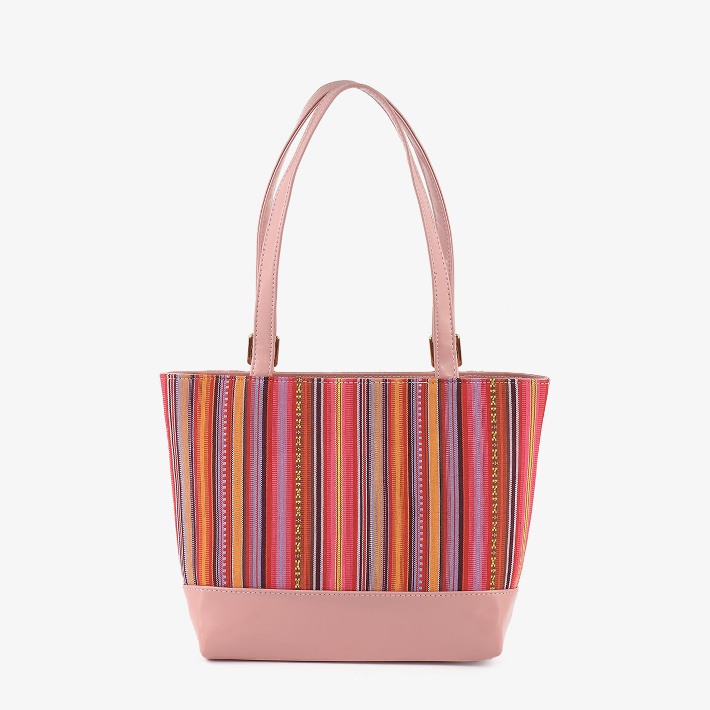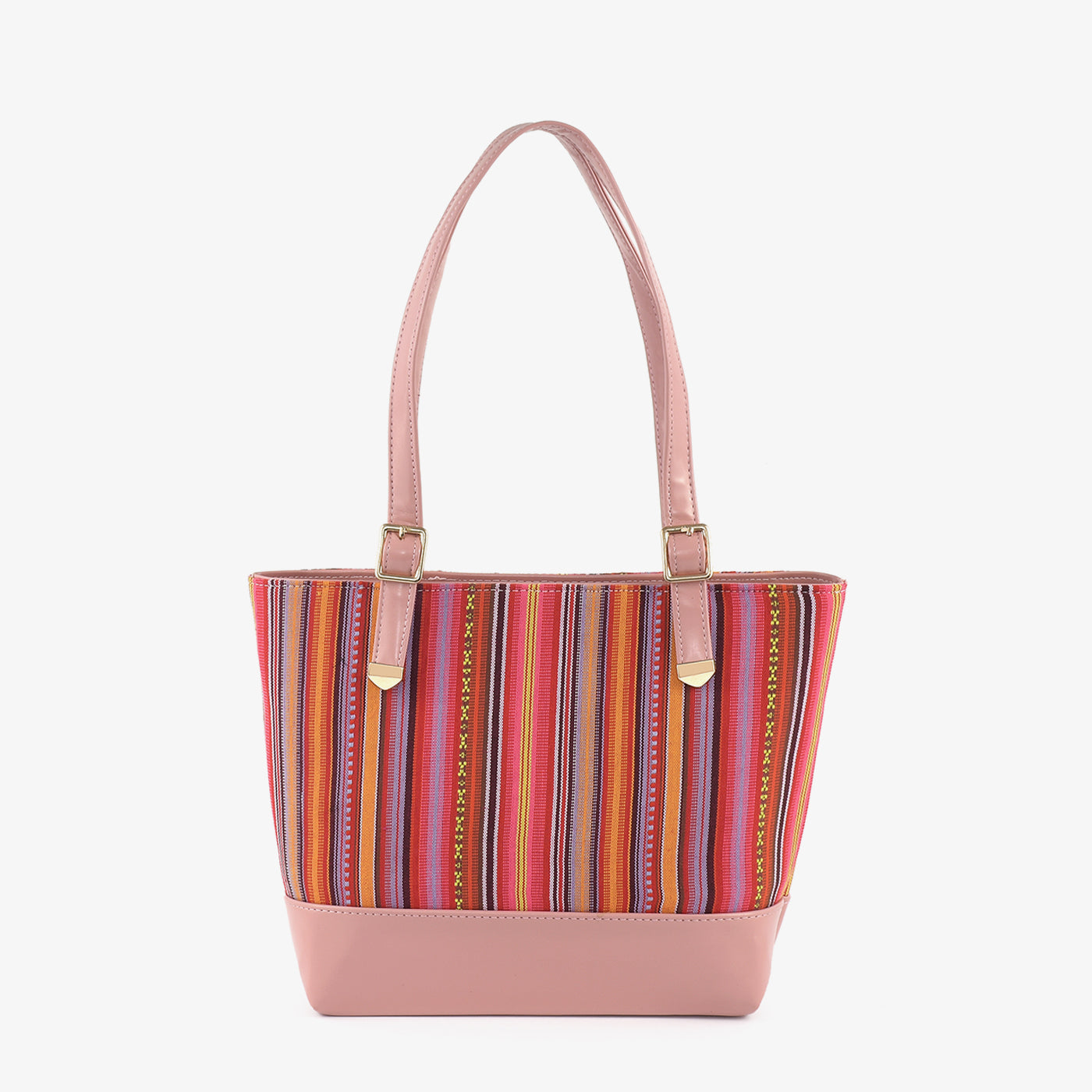 Step into colorful style with this tote bag. It features a vibrant striped pattern on the main body, complemented by a solid lower section and two sturdy top handles. This bag offers a playful yet practical accessory for your daily needs.