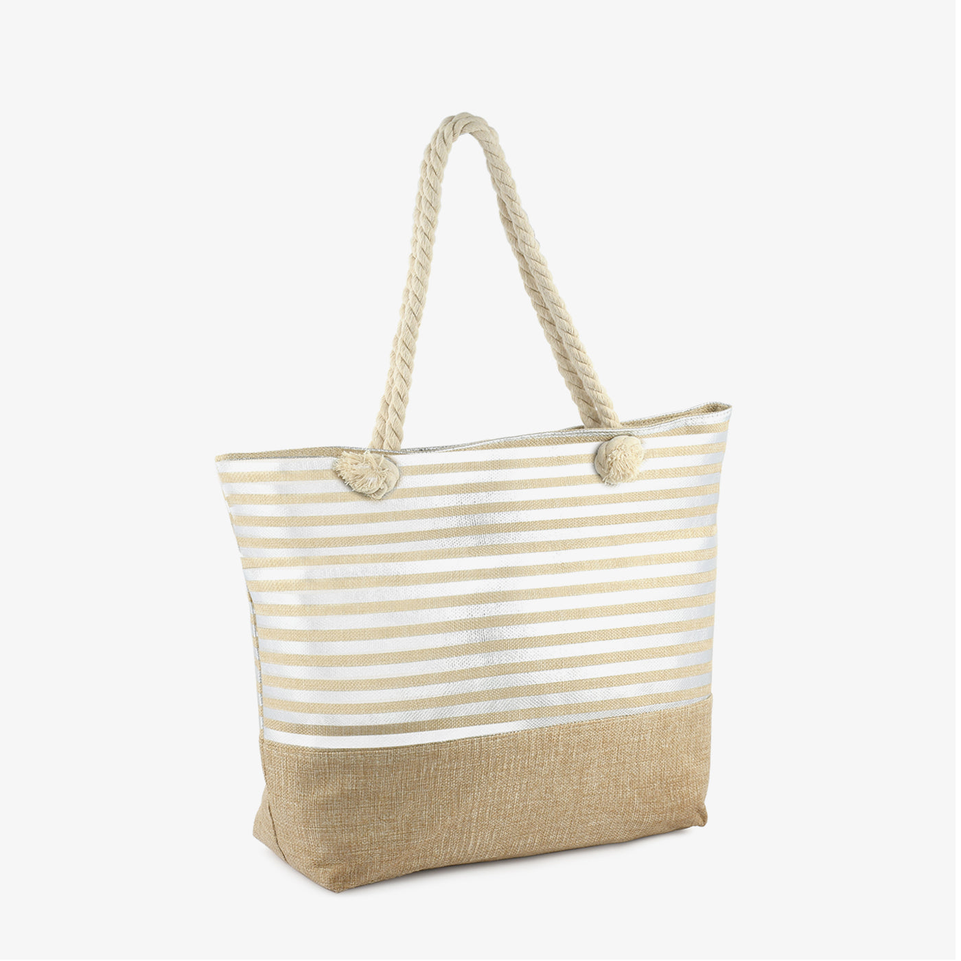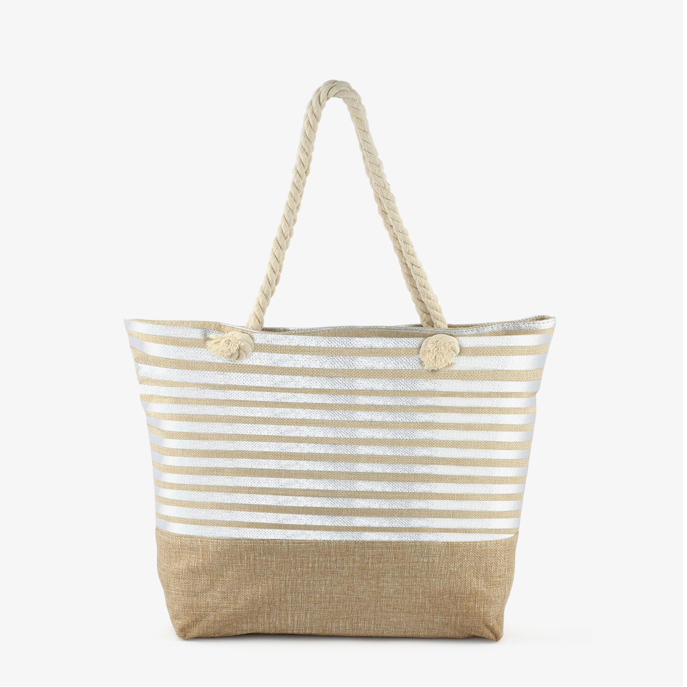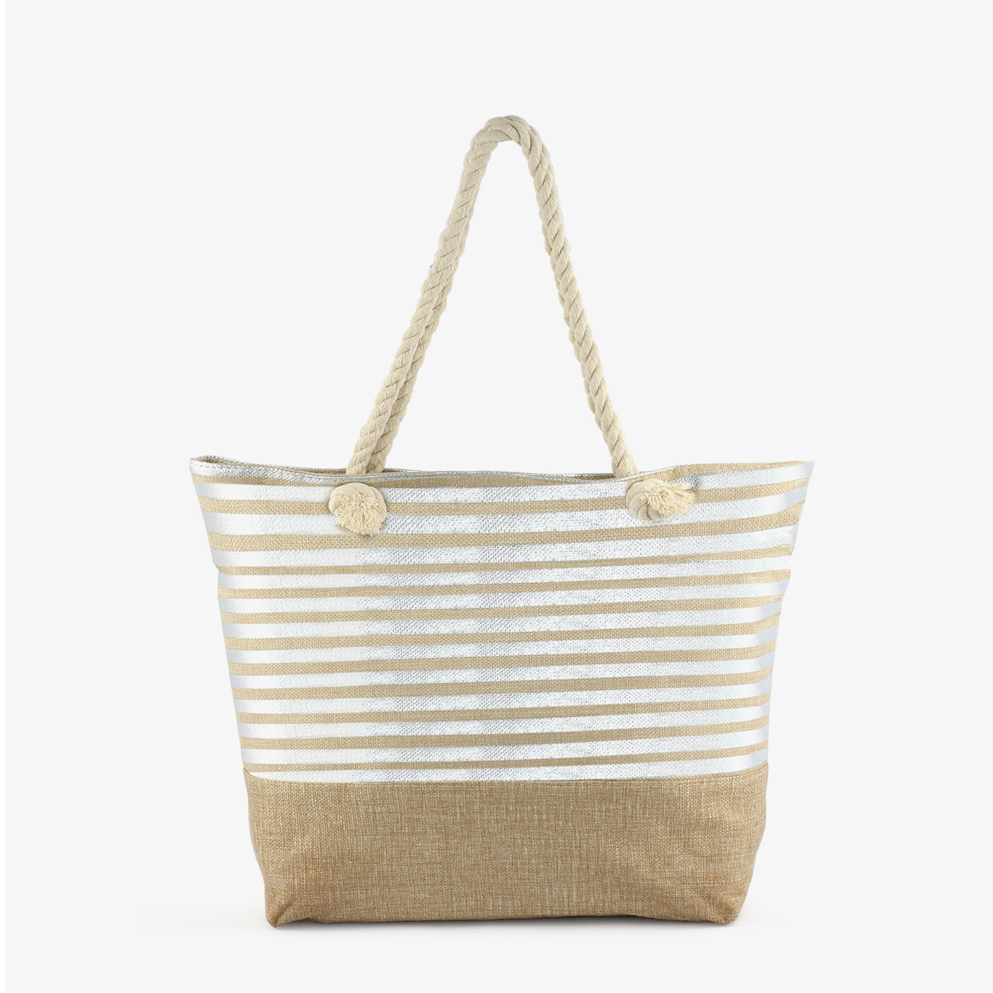 A breezy shoulder bag crafted with a striped shimmer finish, perfect for weekend outings and beach-day styling. Lightweight yet spacious, it offers ample room for daily essentials while keeping a chic, relaxed vibe. The rope handles add a casual touch that fits effortlessly into summer wardrobes.