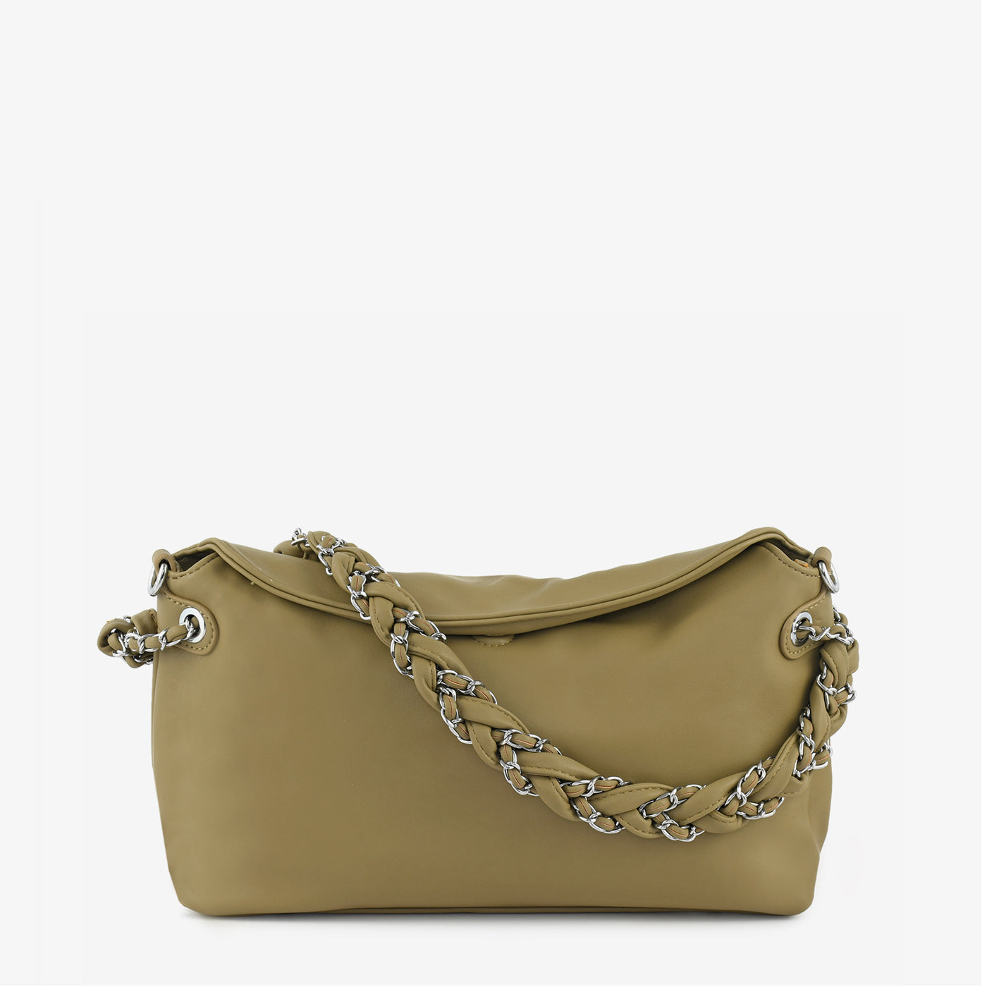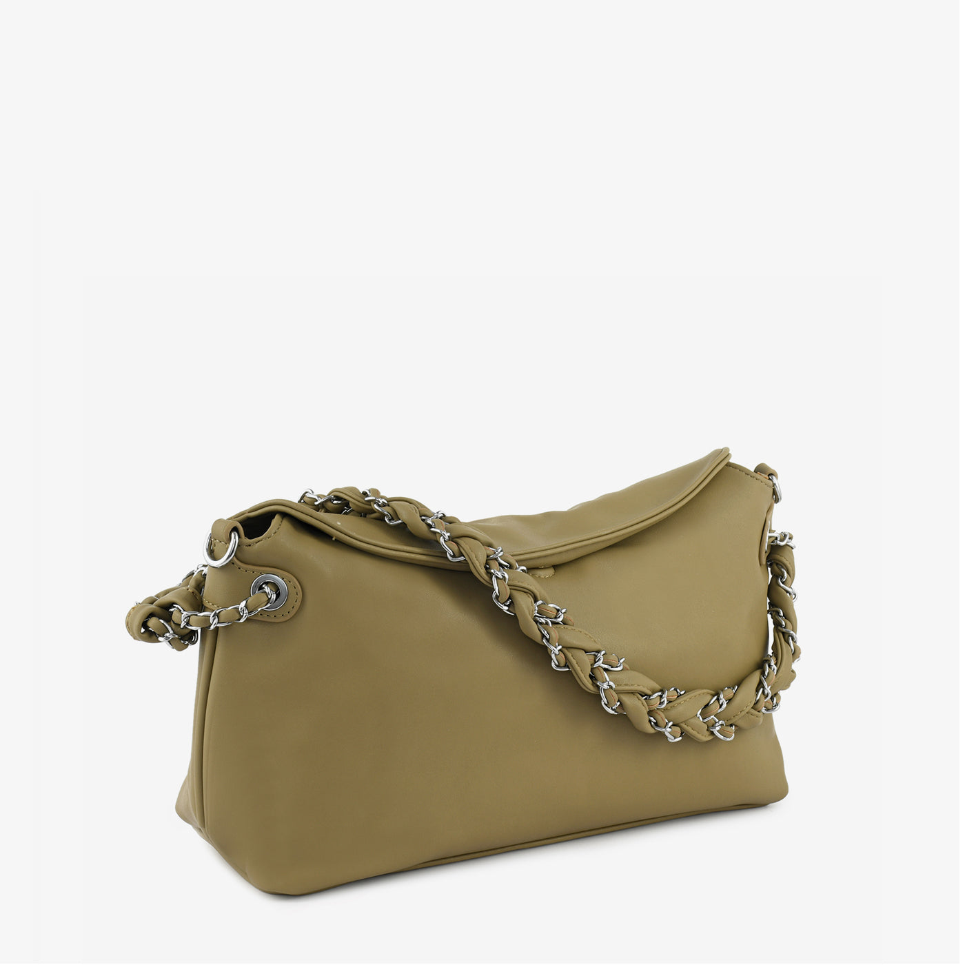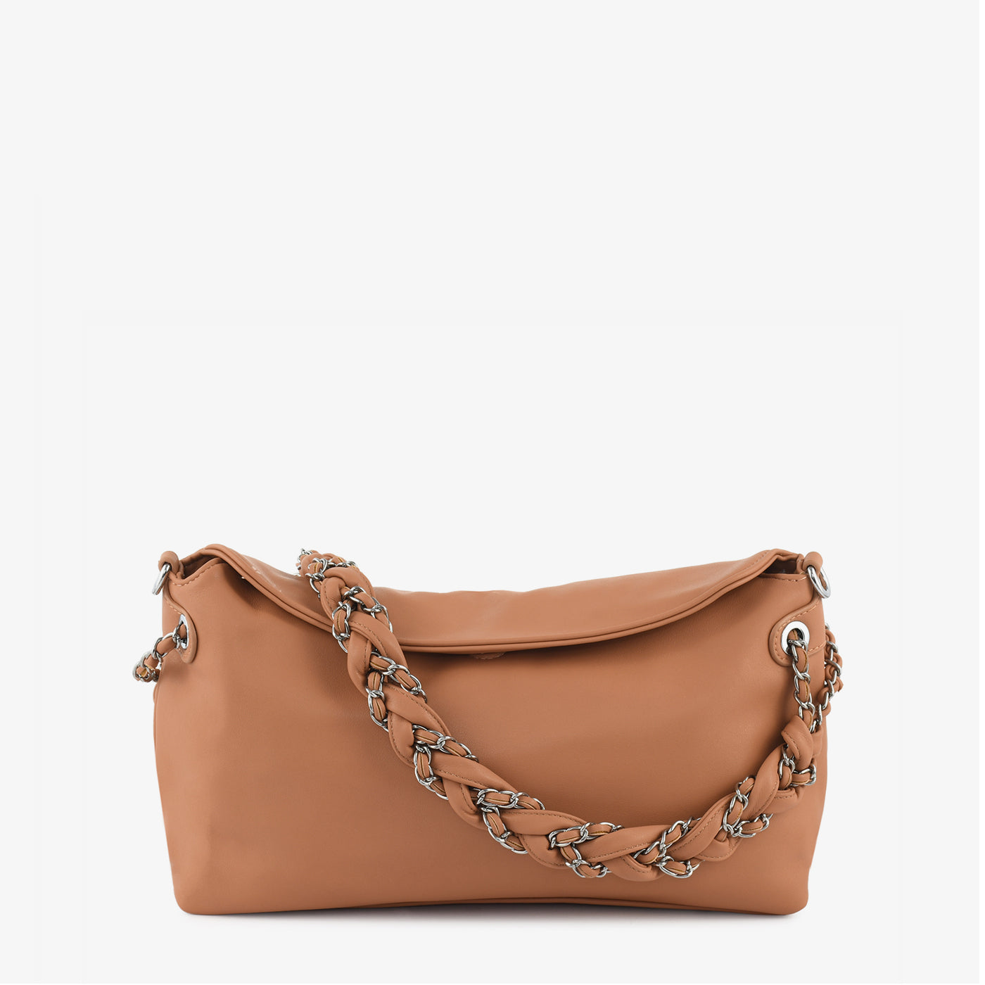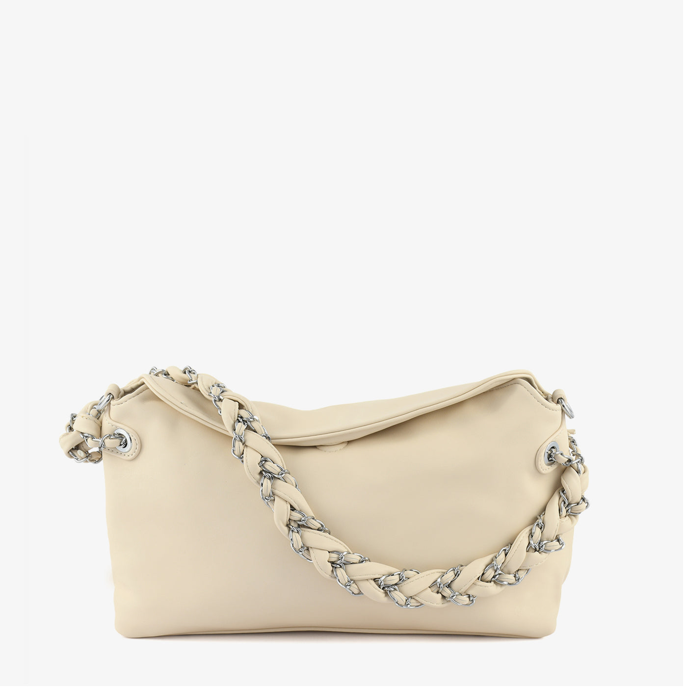 A modern shoulder bag featuring a trending chain-woven strap that adds bold sophistication. The smooth exterior and structured shape make it versatile for both work and outings. With ample space...
