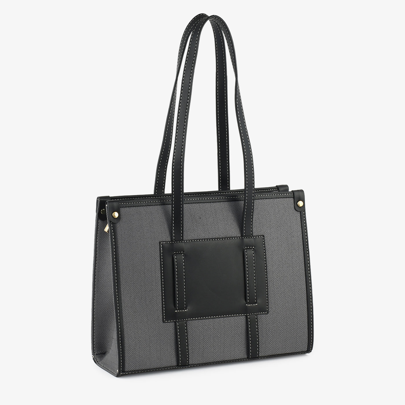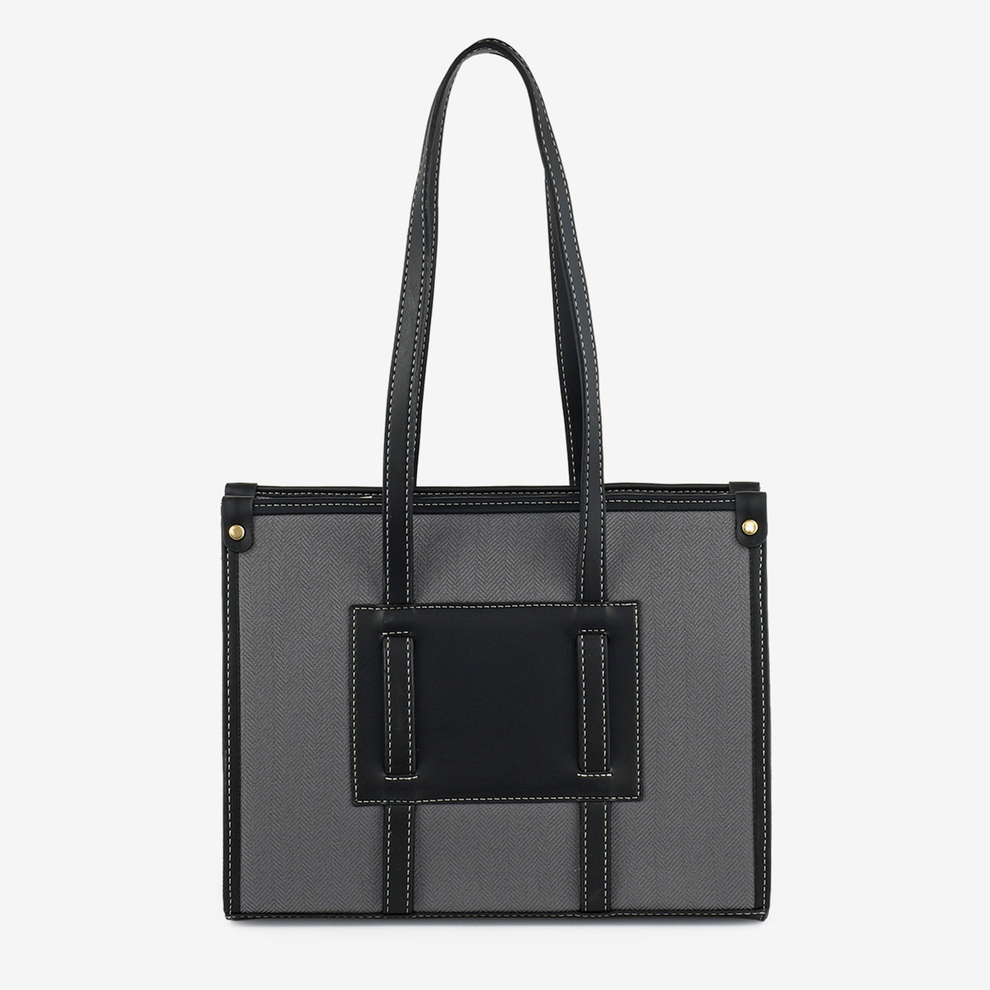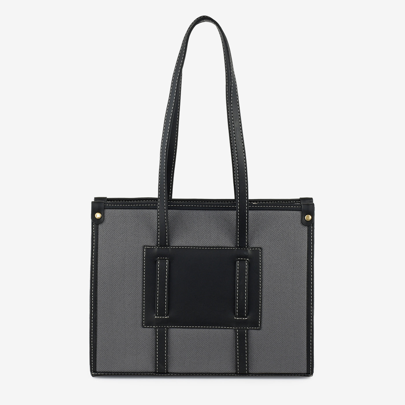 Modern and structured, the "Charcoal Edge" tote pairs muted grey fabric with sleek black accents and contrast stitching. Its elongated handles and roomy interior make it perfect for workdays and casual outings alike.