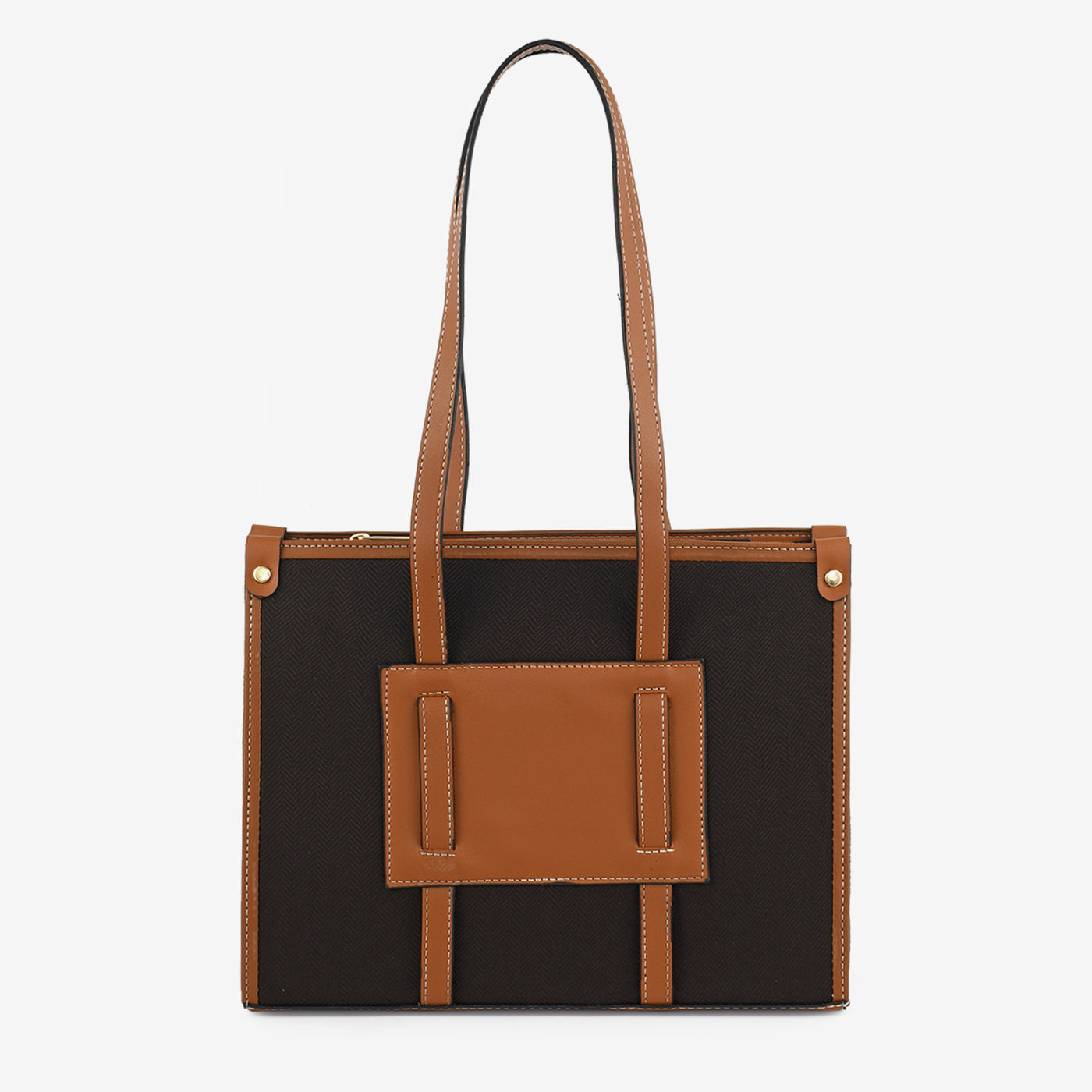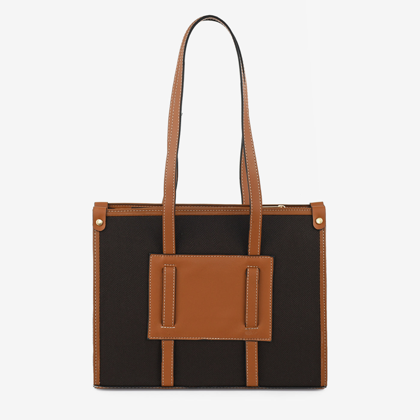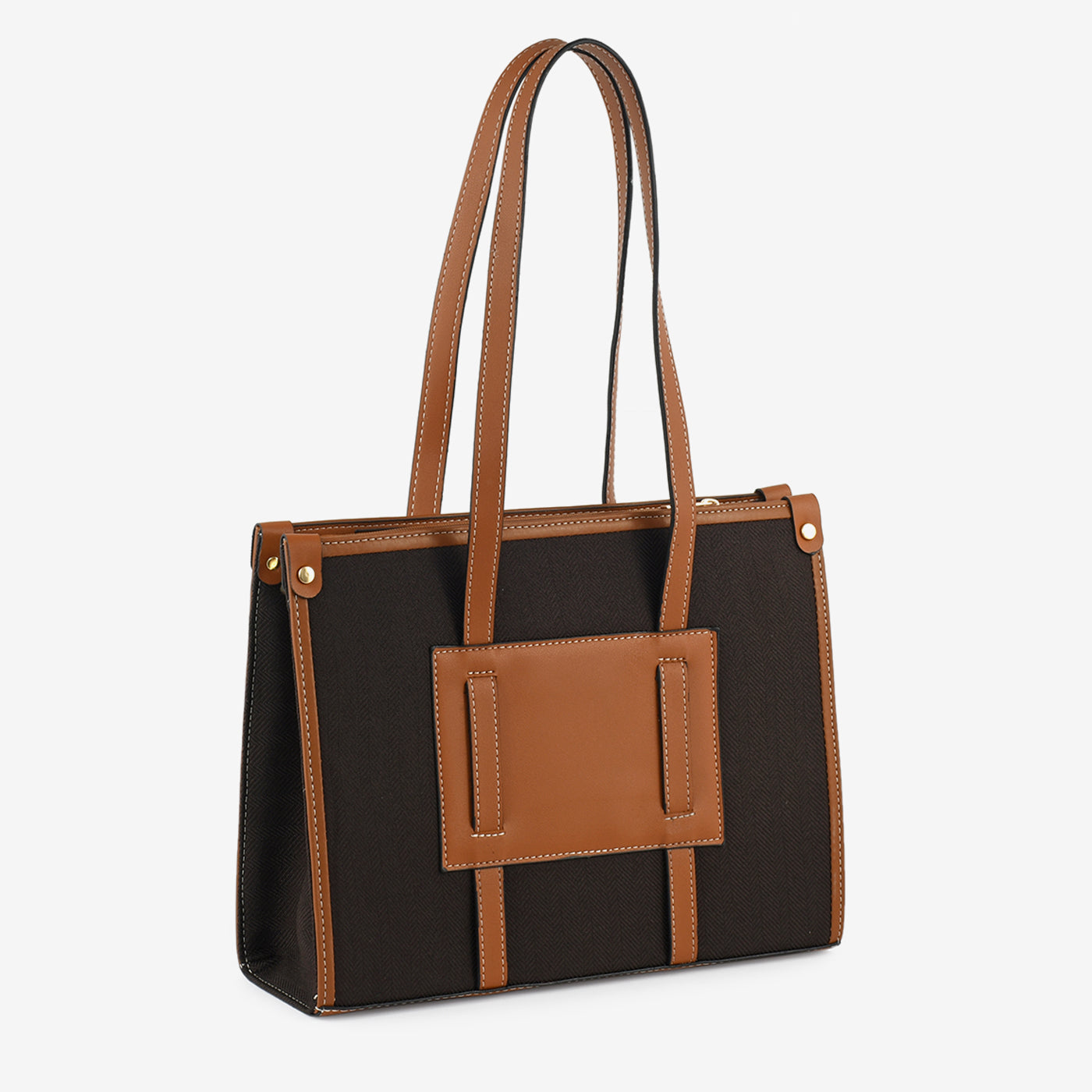 Modern and structured, the "Charcoal Edge" tote pairs muted grey fabric with sleek black accents and contrast stitching. Its elongated handles and roomy interior make it perfect for workdays and casual outings alike.