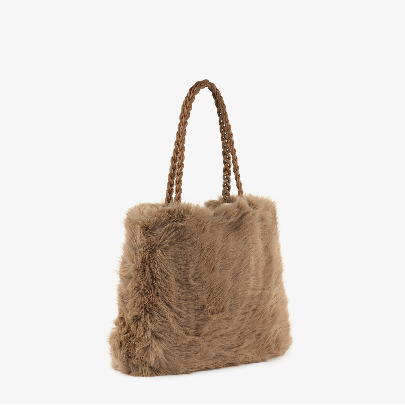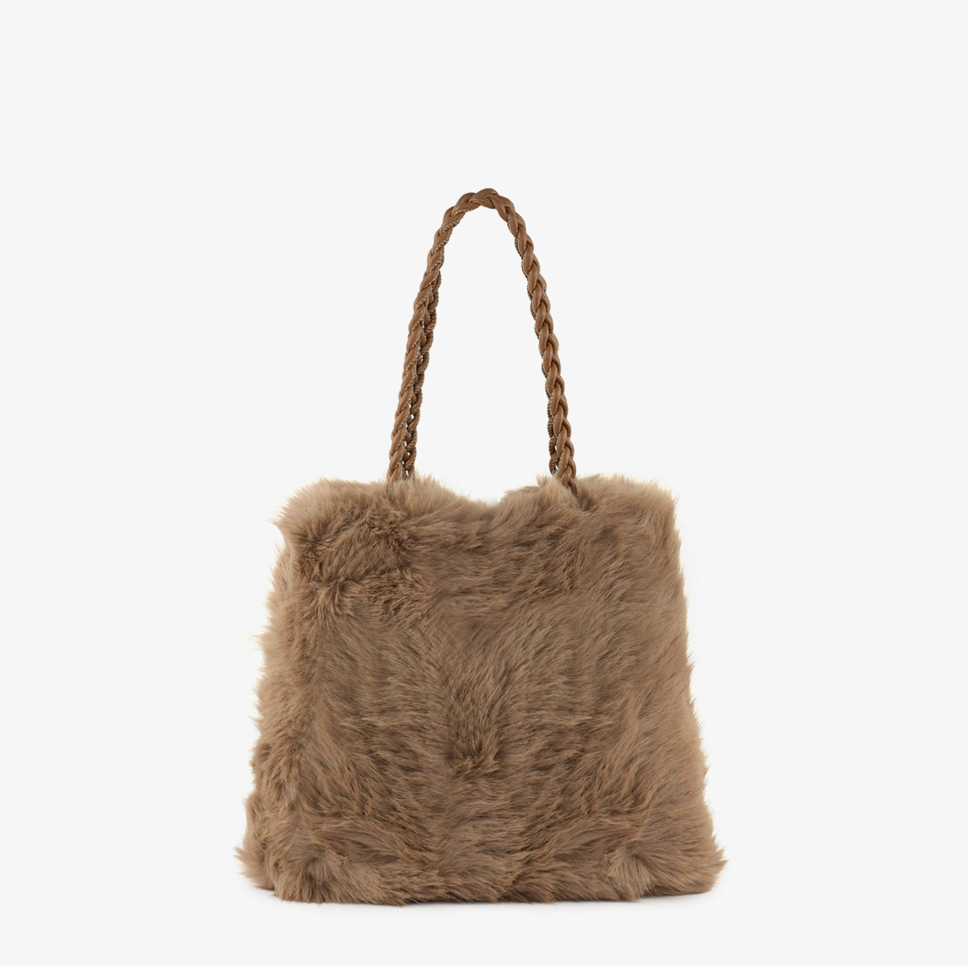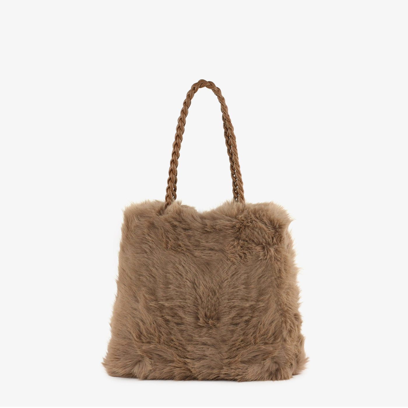 A spacious tote bag constructed from a soft faux fur exterior that brings a rich, textural warmth to everyday carry and casual occasion styling. The structured rectangular silhouette provides generous interior space for daily essentials while maintaining a neat, composed form. Dual braided chain-threaded handles add a refined contrast to the plush exterior, combining practicality with a polished finishing detail. The lightweight construction and comfortable shoulder carry make this handbag a versatile choice for casual outings and relaxed everyday use.