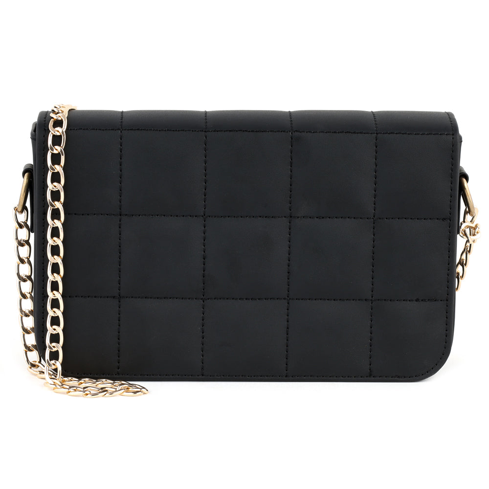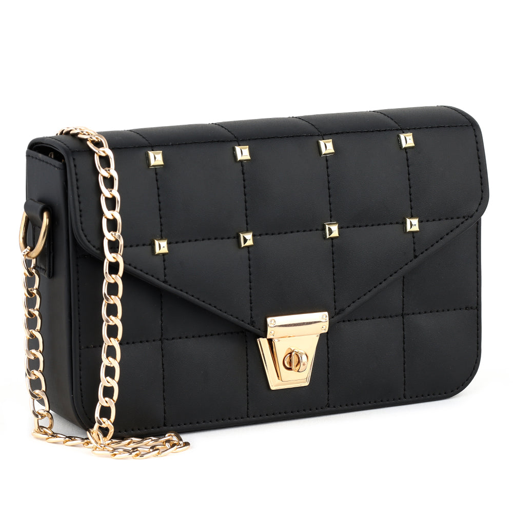 Our shoulder bag features rock studs adorning the quilted flap. You can style it with your casual dresses.