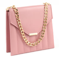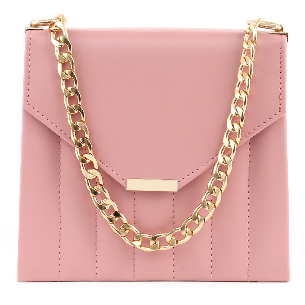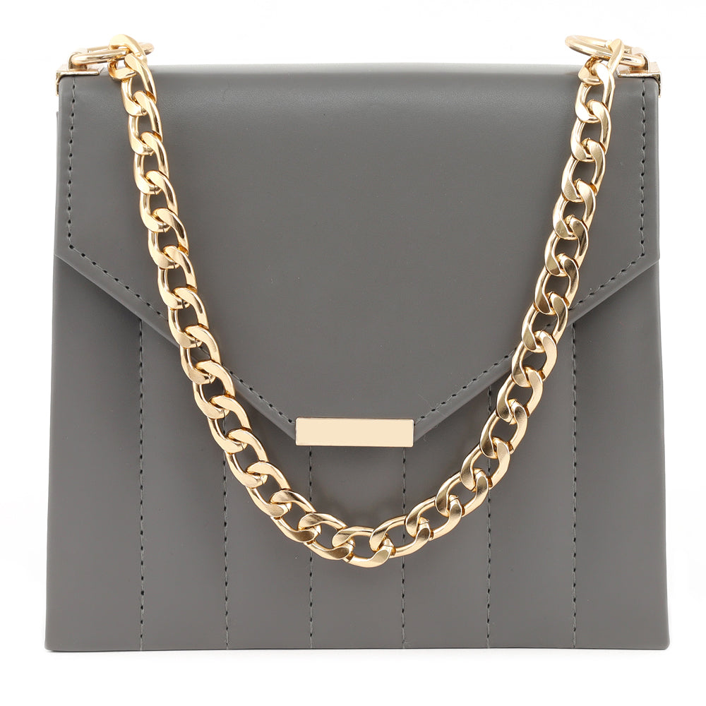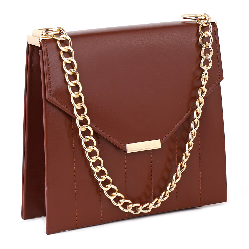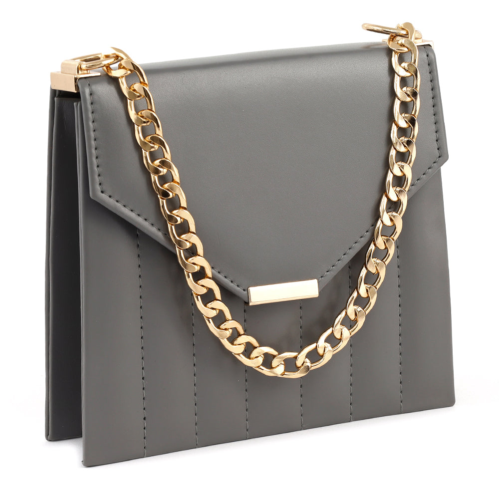 Design: Envelope flap with vertical stitching and gold-tone chain strap