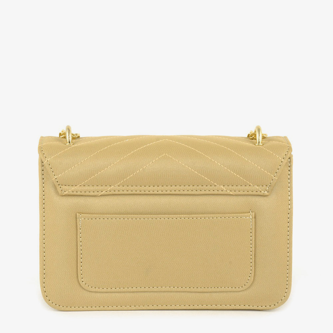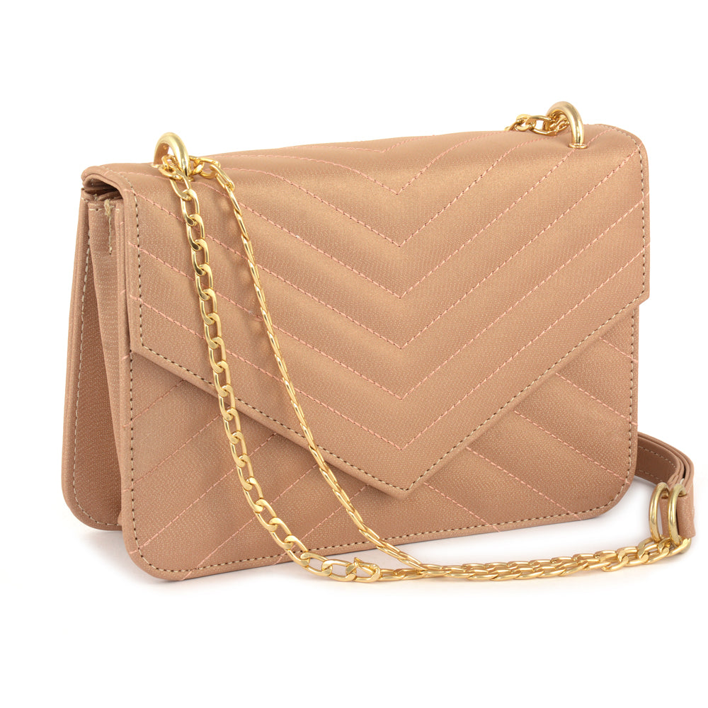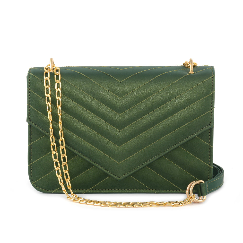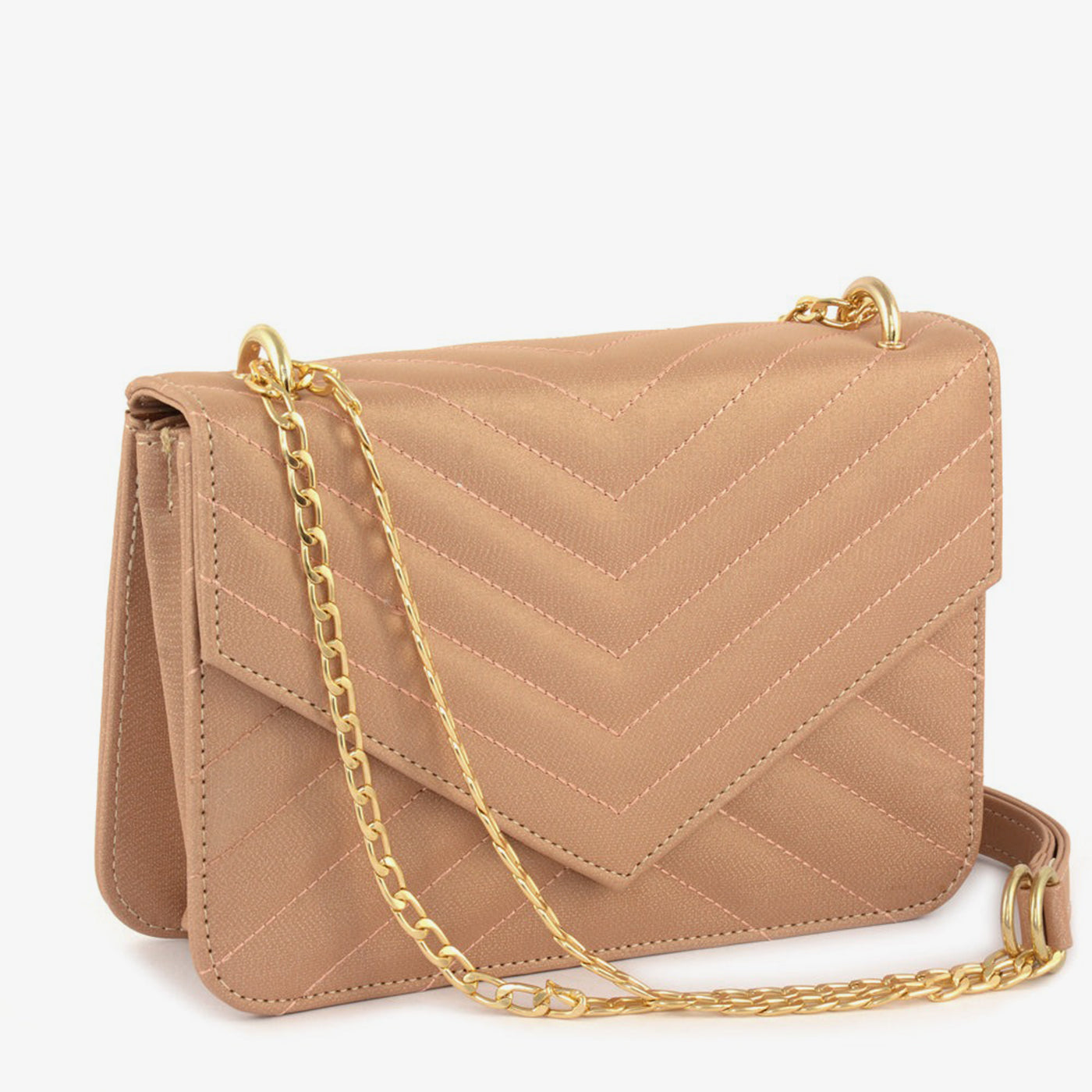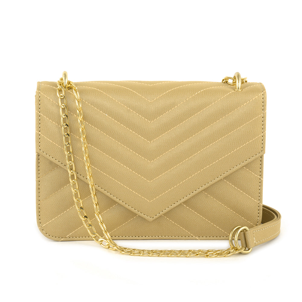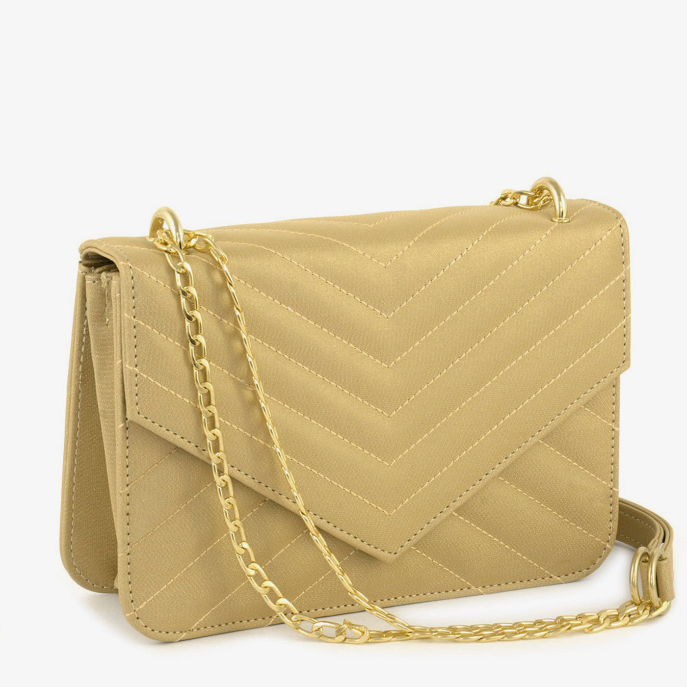 This sleek shoulder bag features a chevron-quilted flap and slim silhouette for a clean, elevated look. The gold-tone chain adds a touch of polish, perfect for refined daytime dressing.