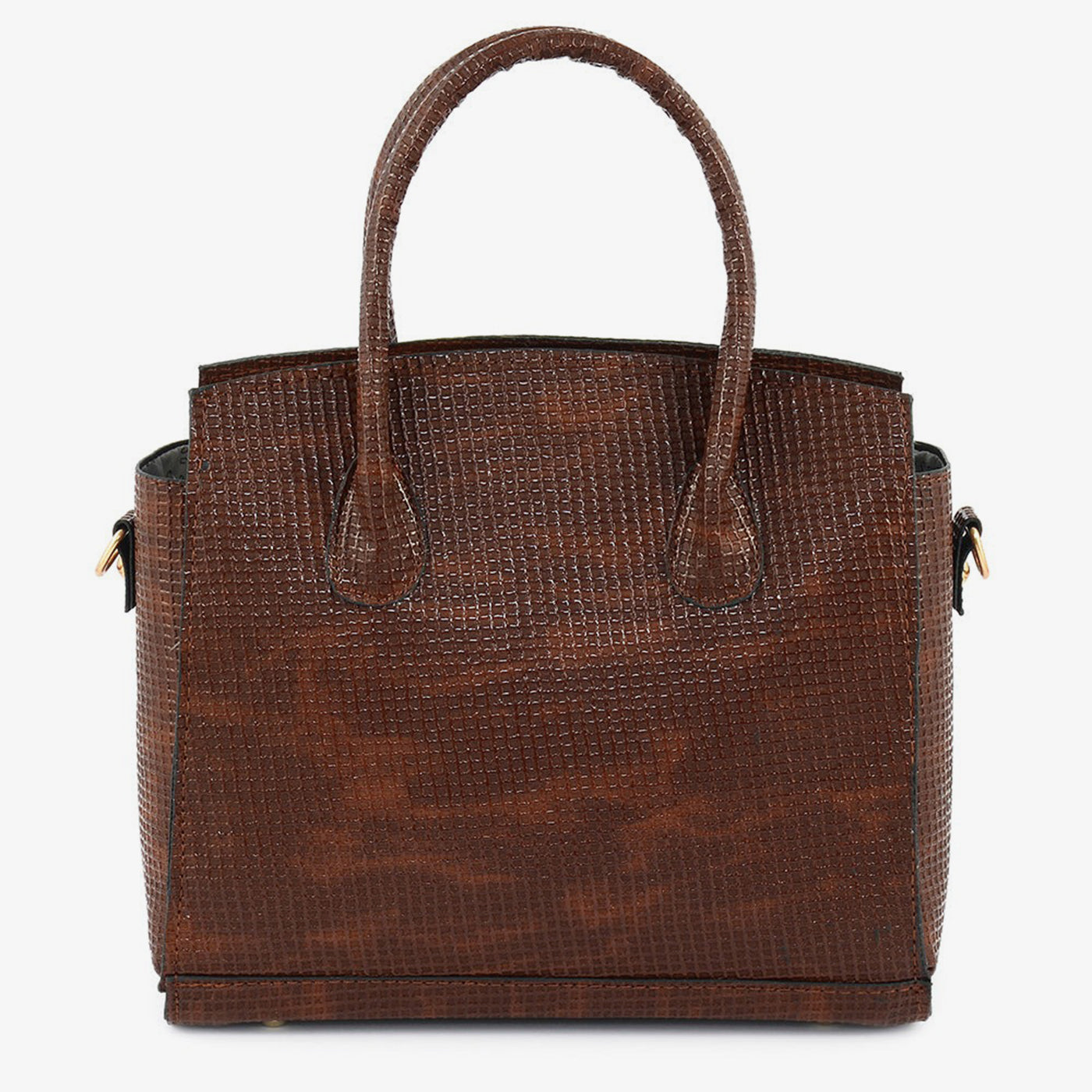 Carry your belongings with a touch of natural sophistication in this brown textured satchel, featuring a subtle reptile-like pattern. Its structured design is ideal for adding a refined touch to your style in Lahore.