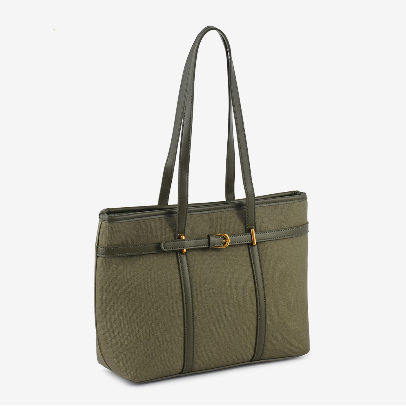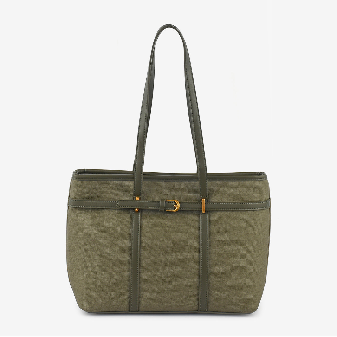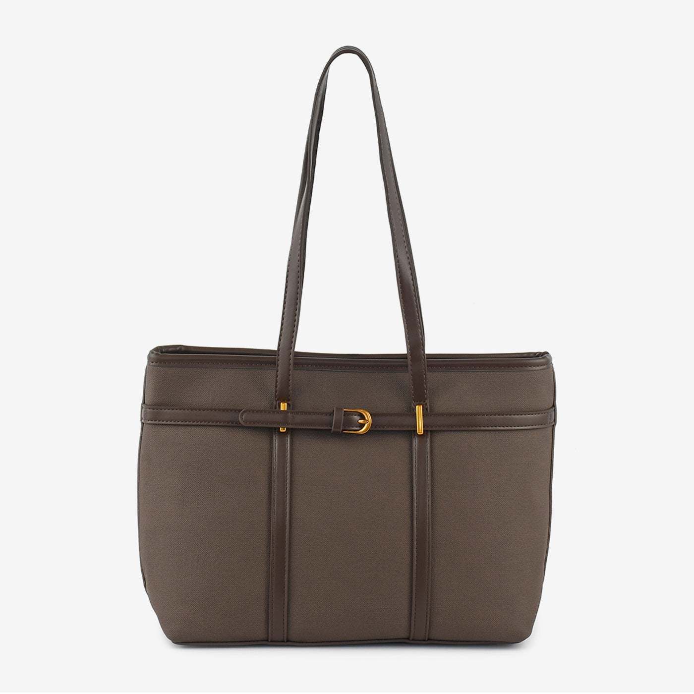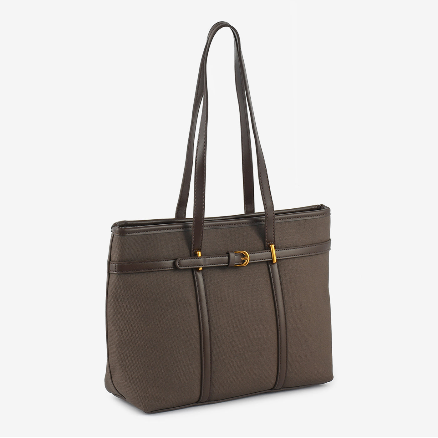 • Design: Structured shoulder tote with front belt detail and long shoulder straps
