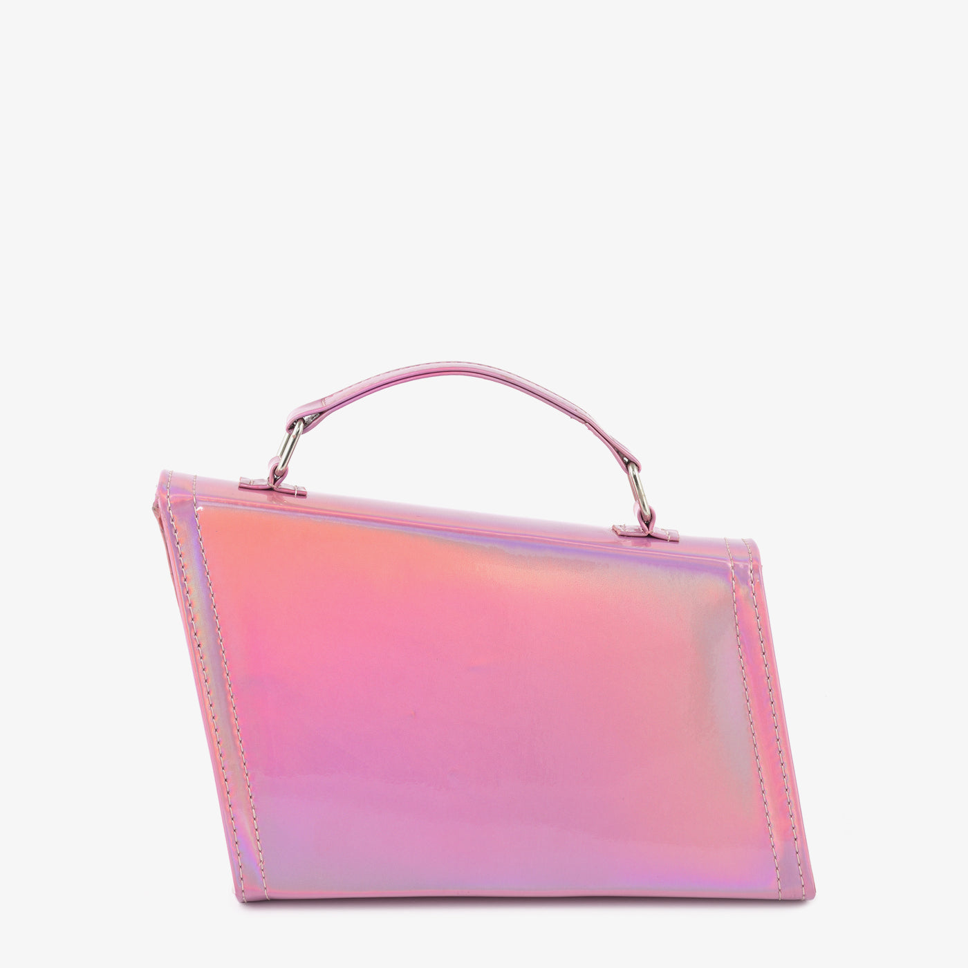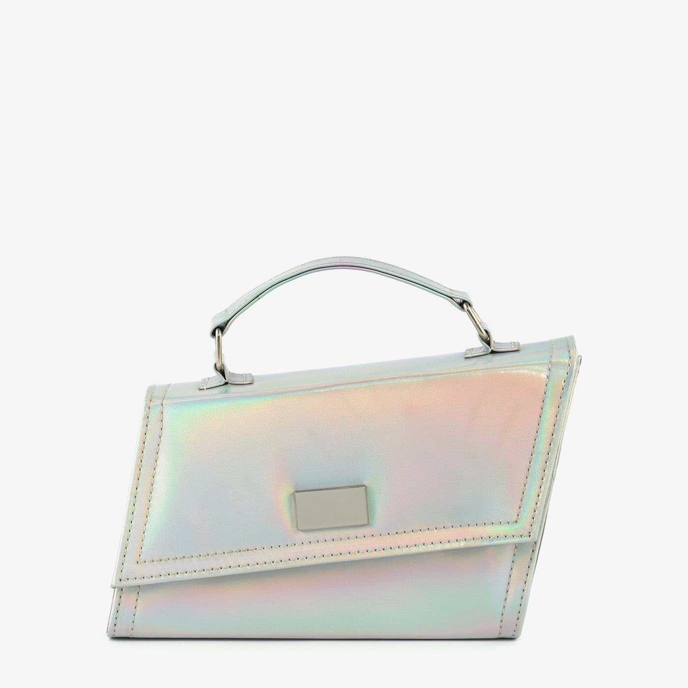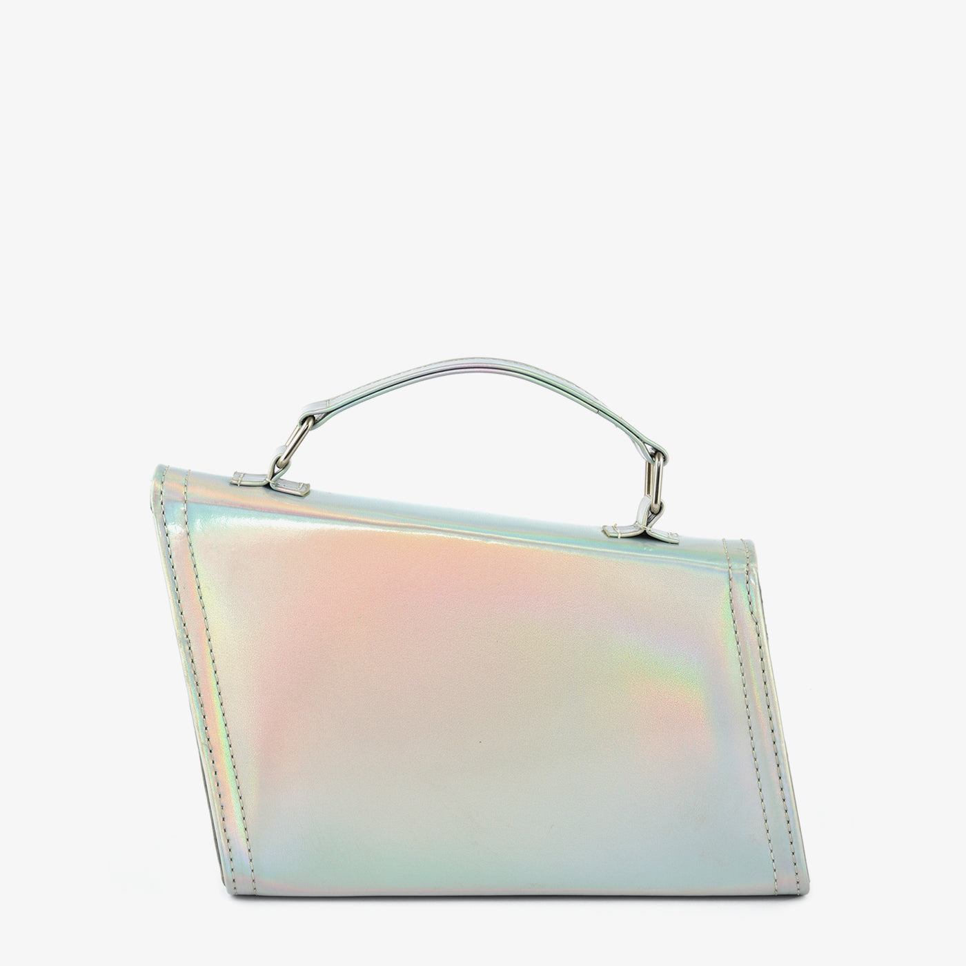 The Prism bag captivates with its unique, geometric shape and eye-catching, holographic finish. The iridescent material shifts colors in the light, creating a mesmerizing effect. The sleek design is complemented by a metallic handle and a small logo plate.
