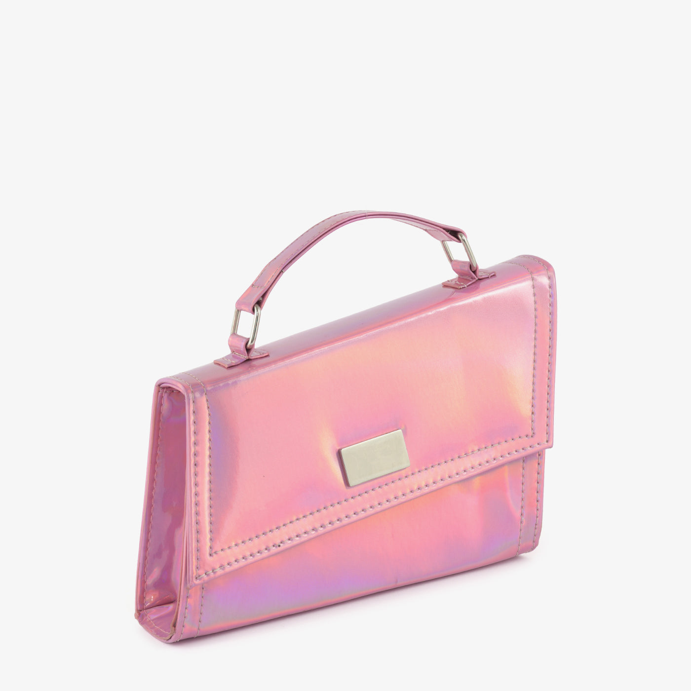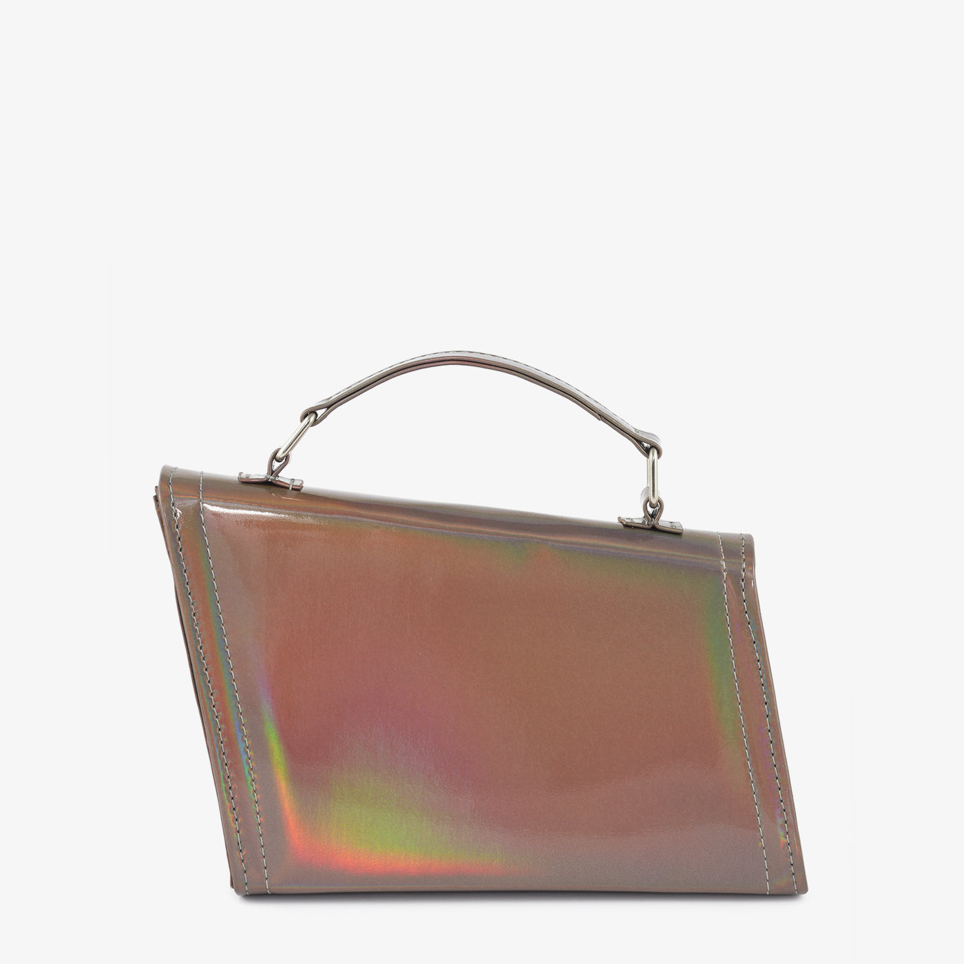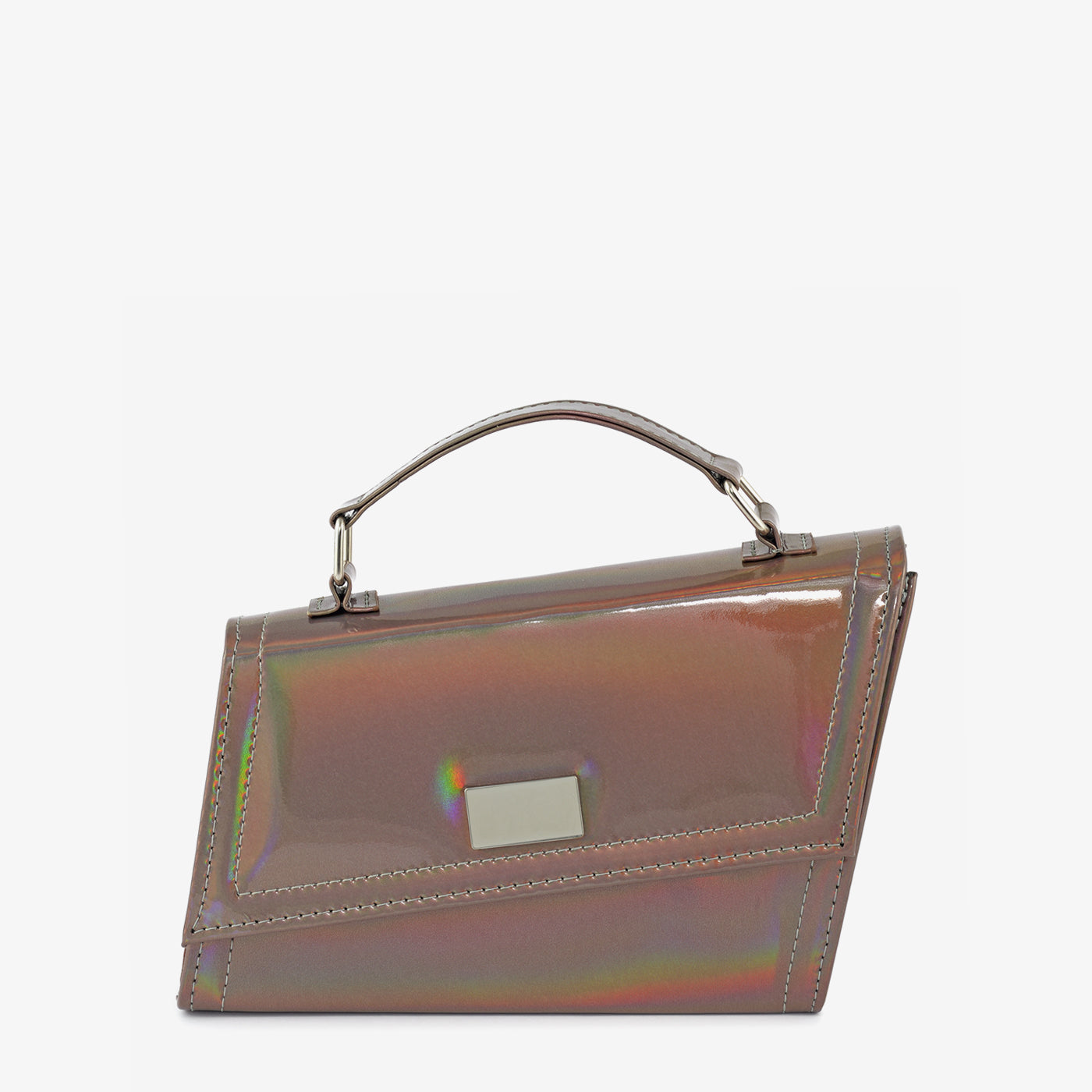 The Prism bag captivates with its unique, geometric shape and eye-catching, holographic finish. The iridescent material shifts colors in the light, creating a mesmerizing effect. The sleek design is complemented by a metallic handle and a small logo plate.