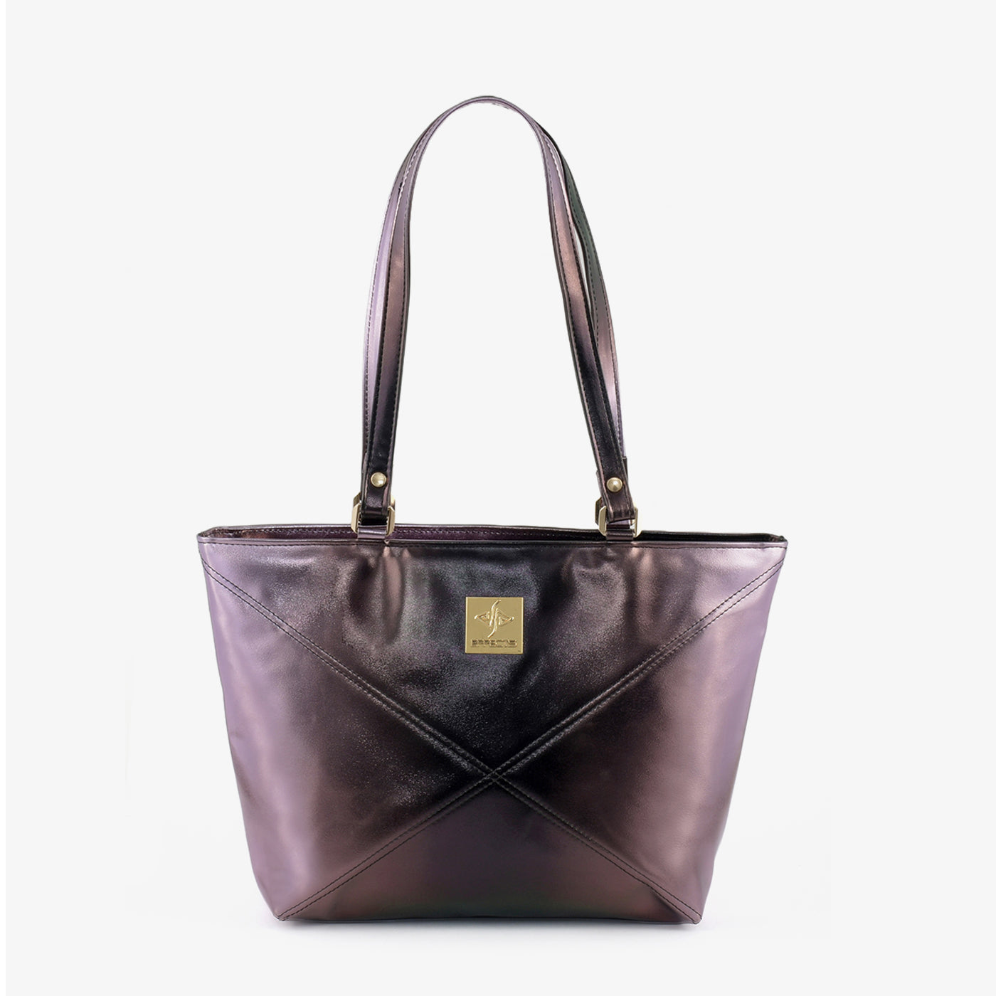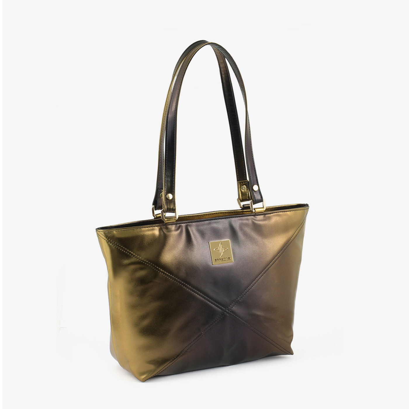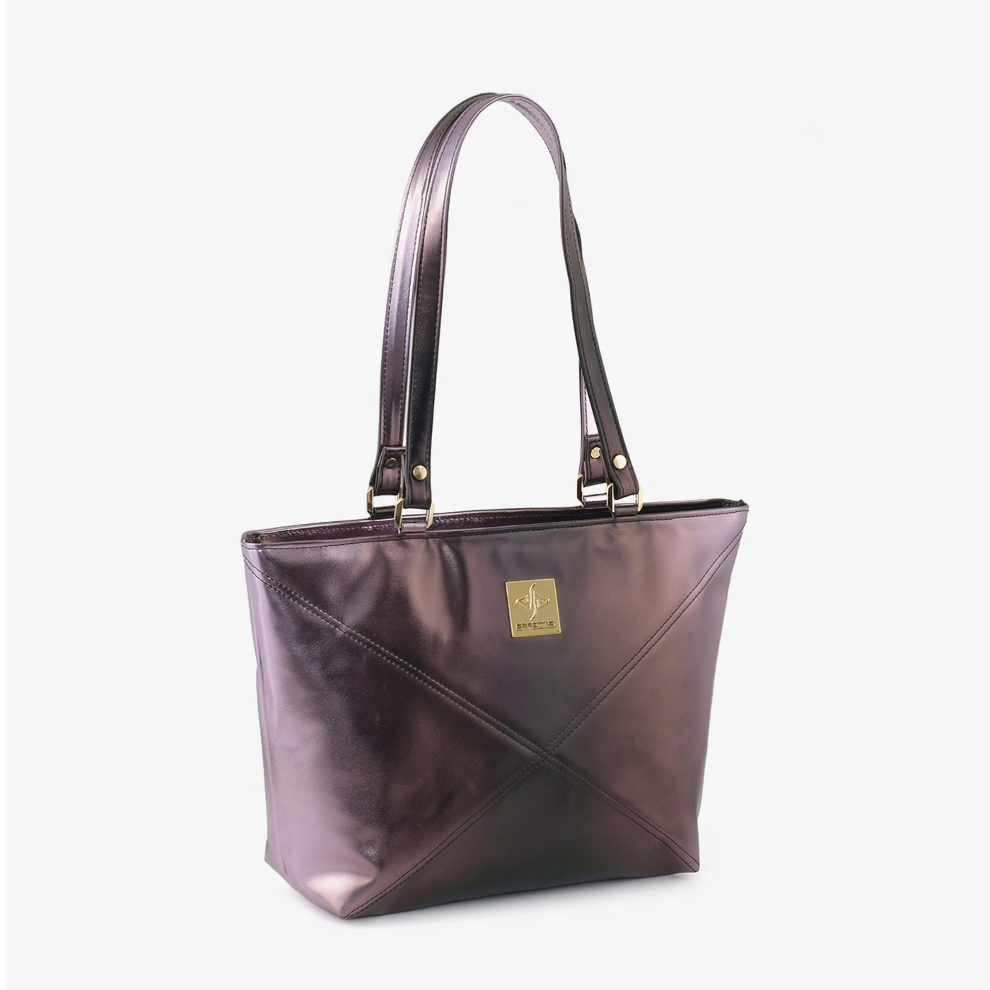 Carry your essentials in style with the "Geometric Gleam Tote". This striking metallic brown tote features a unique geometric design, adding a touch of modern sophistication to any outfit. The sturdy top handles and spacious interior make it perfect for everyday use.