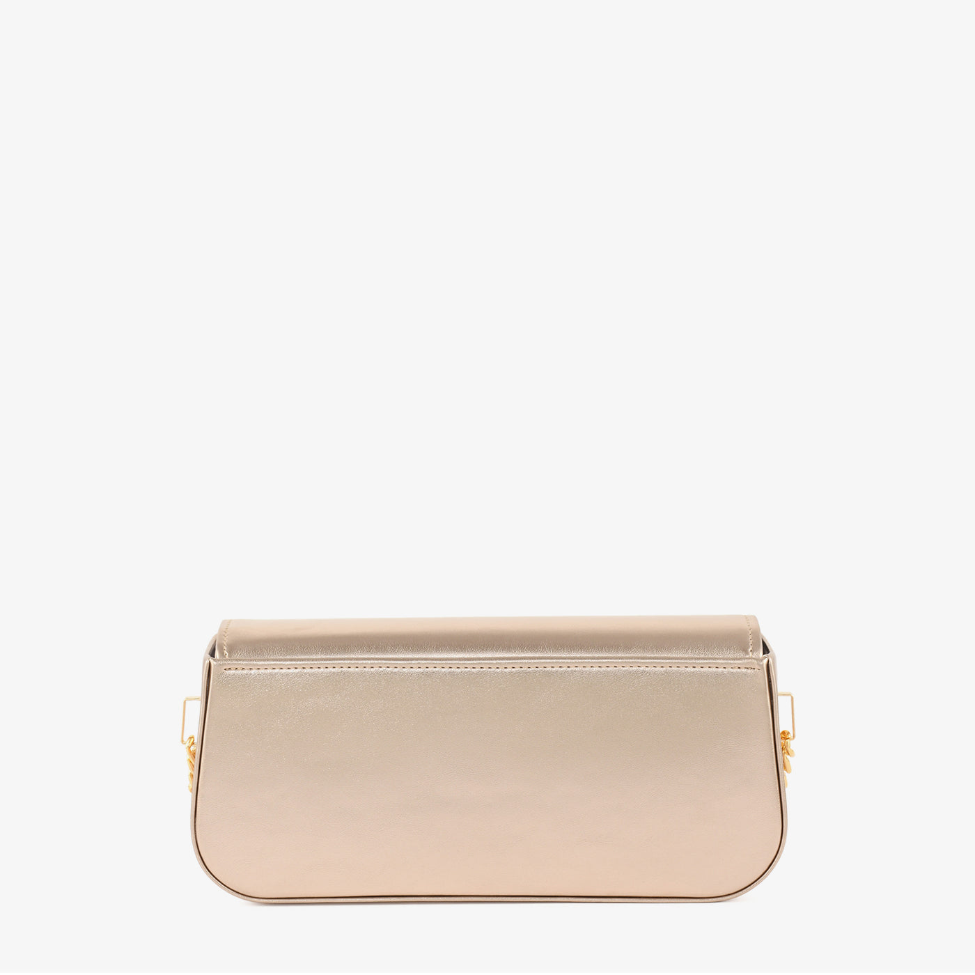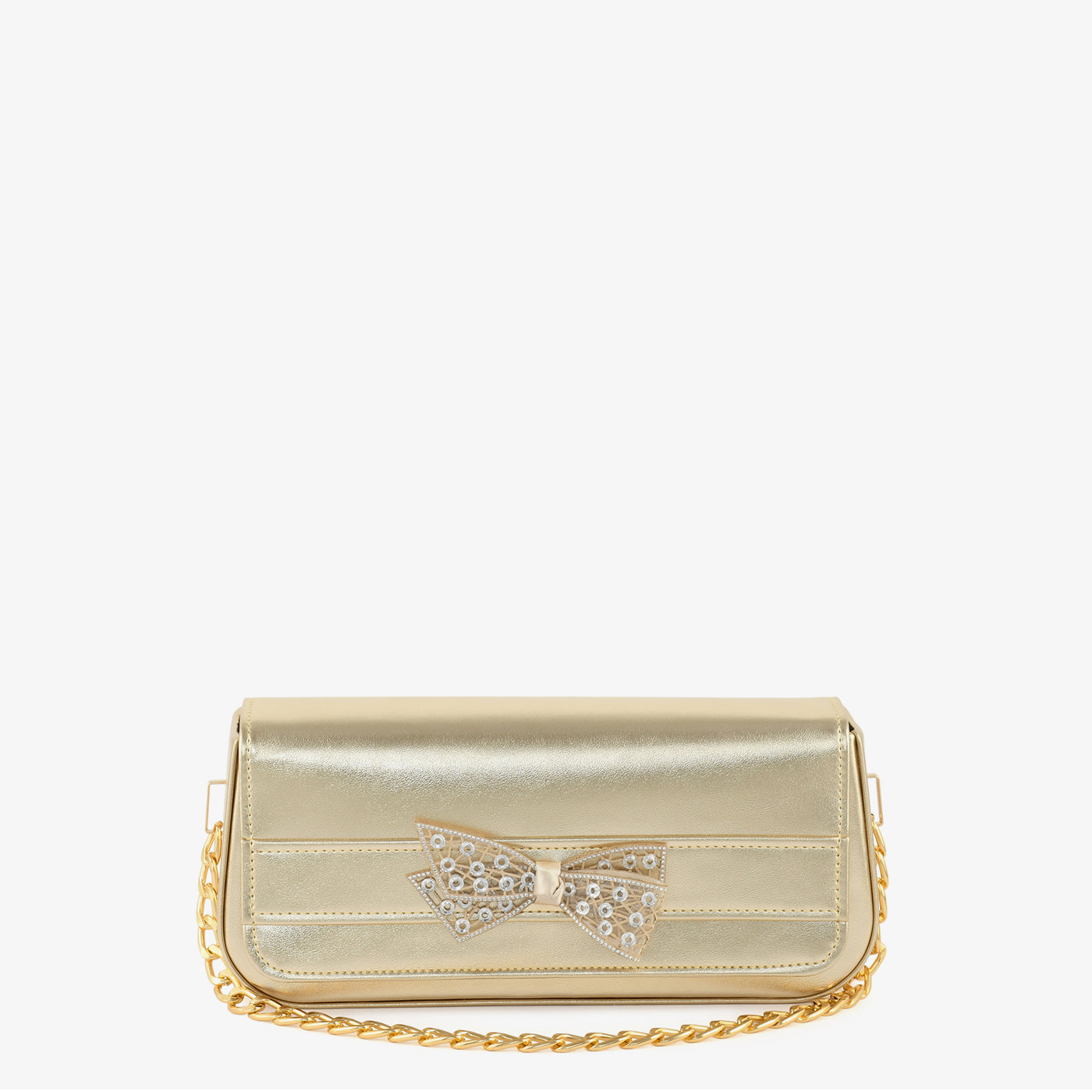- Material: Metallic patent faux upper, tonal topstitched panel lines, sheer daisy-stitch lace bow appliqué, satin knot centre, chunky gold-tone chain strap, magnetic snap closure, smooth interior lining