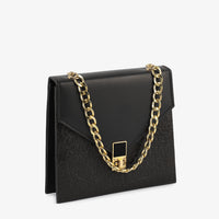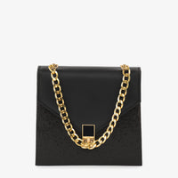 Elevate your evening ensemble with this elegant women's bag. It features a sleek, square silhouette with a smooth, black texture. A gold-toned chain strap and a matching clasp add...