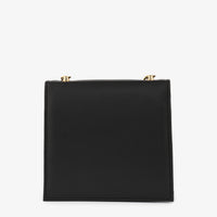 Elevate your evening ensemble with this elegant women's bag. It features a sleek, square silhouette with a smooth, black texture. A gold-toned chain strap and a matching clasp add a touch of sophistication.