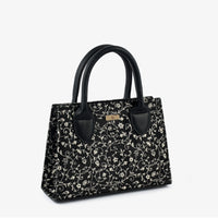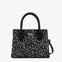 The Vineyard Bloom Mini Tote offers a charming blend of classic design and whimsical detail. Featuring a delicate black and white floral vine print, it adds a touch of vintage-inspired elegance to your look. The structured silhouette and contrasting black handles provide a polished finish, while the compact interior keeps your essentials organized.