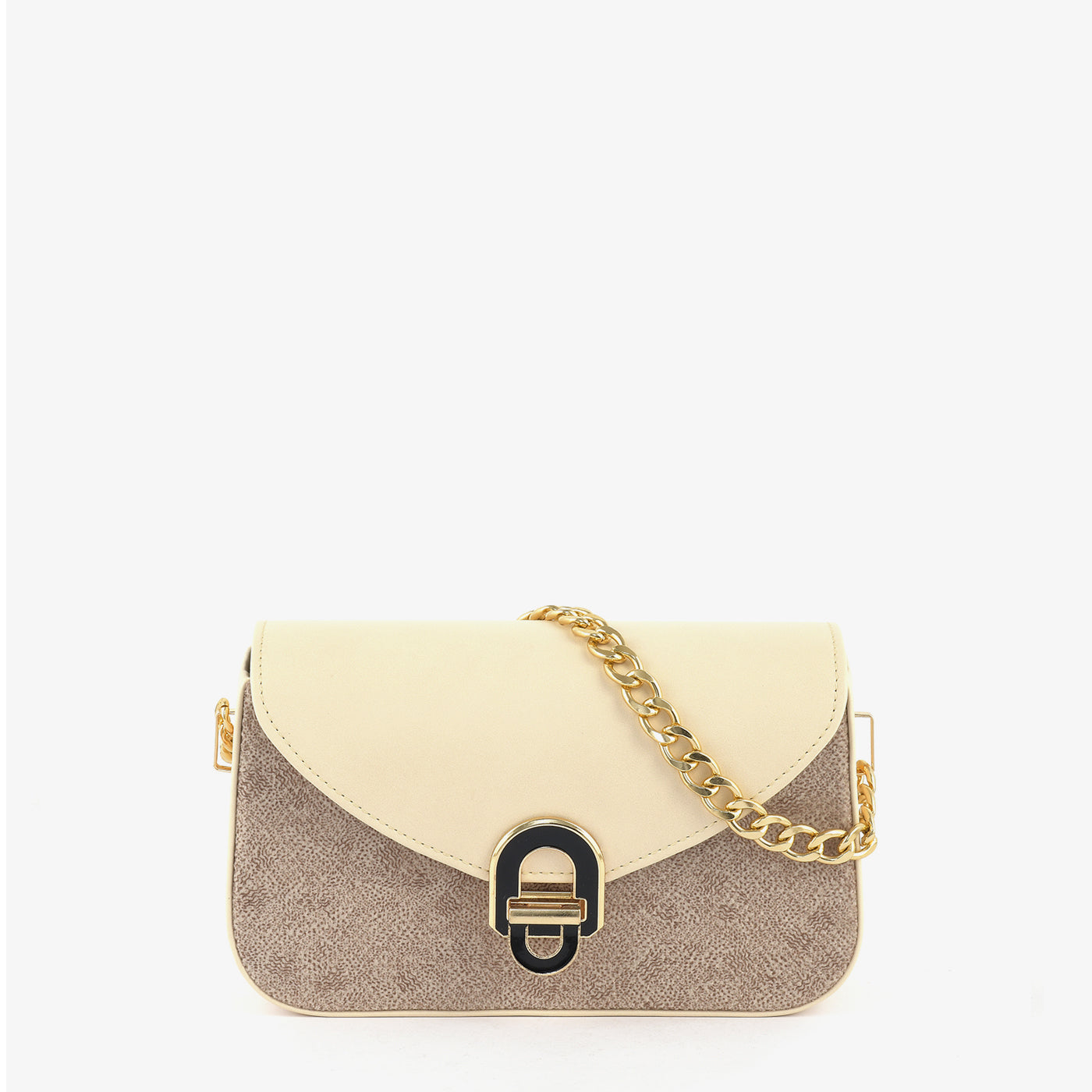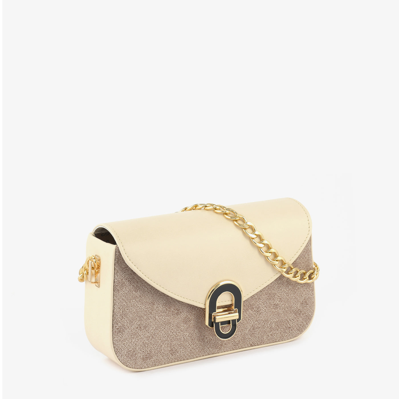 Carry a touch of understated elegance with the "Earthy Contrast Chain Bag." This stylish bag features a textured base in a warm, earthy tone contrasted by a smooth, light-colored flap. The chic, minimalist clasp and gold chain strap add a touch of modern sophistication, perfect for elevating your look.
