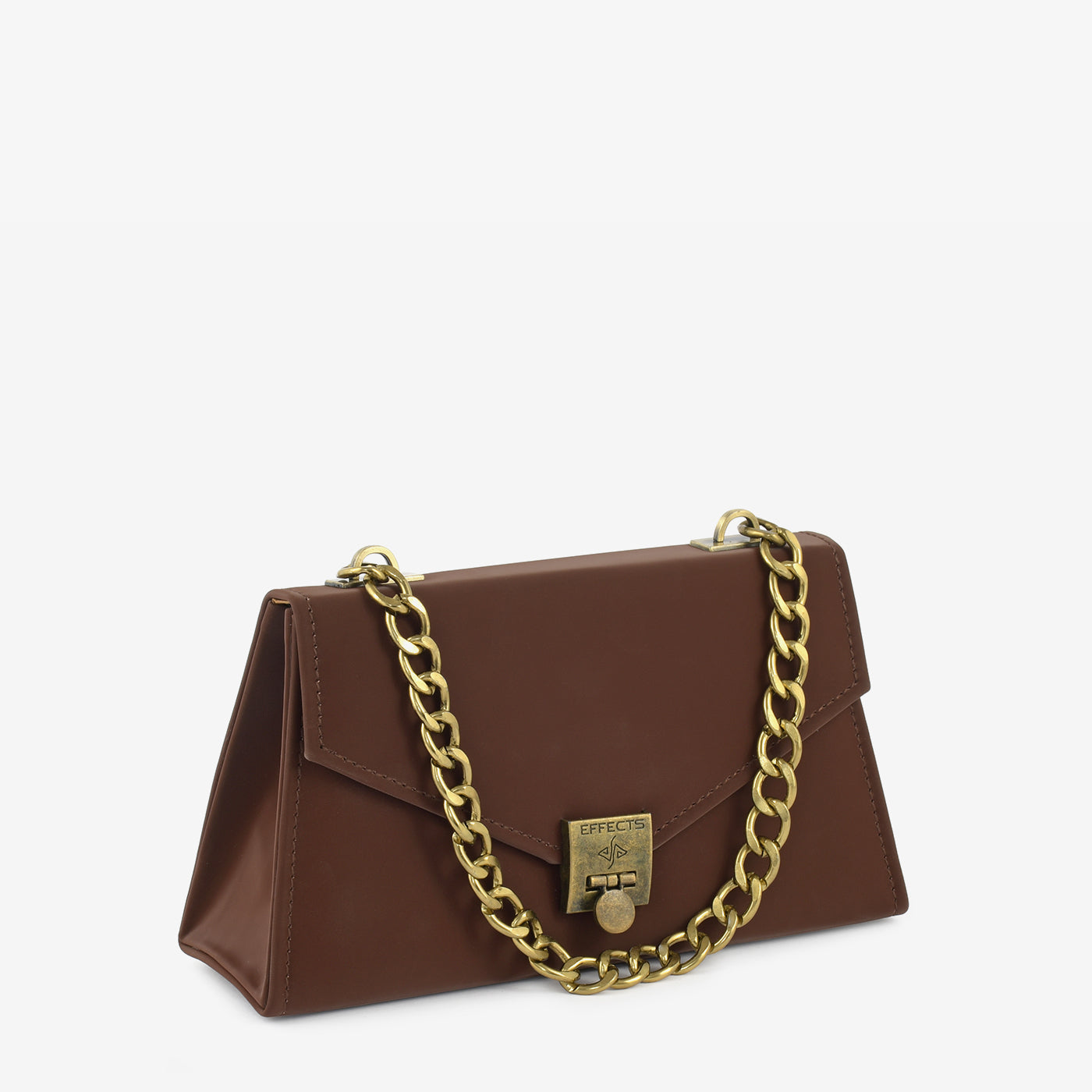 Carry your essentials in style with this sophisticated caramel-brown bag. The clean lines and rich color are beautifully accented by the bold gold chain strap, adding a touch of timeless elegance.
