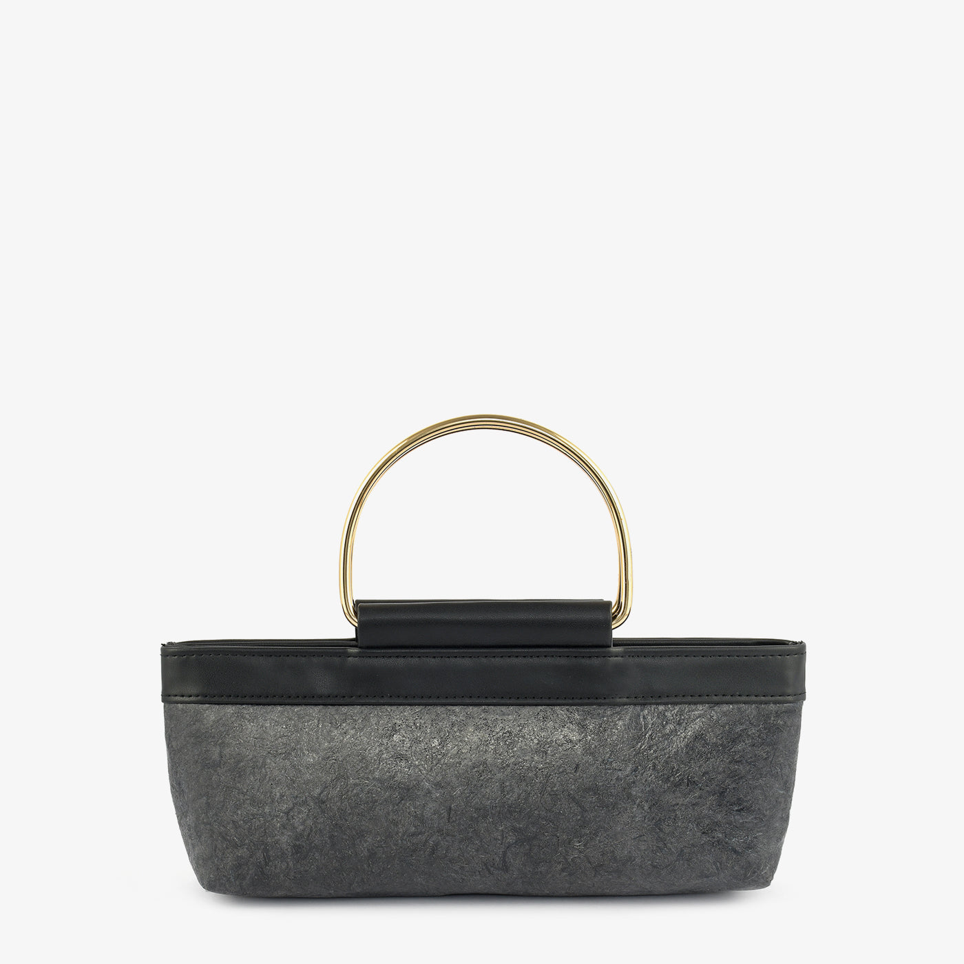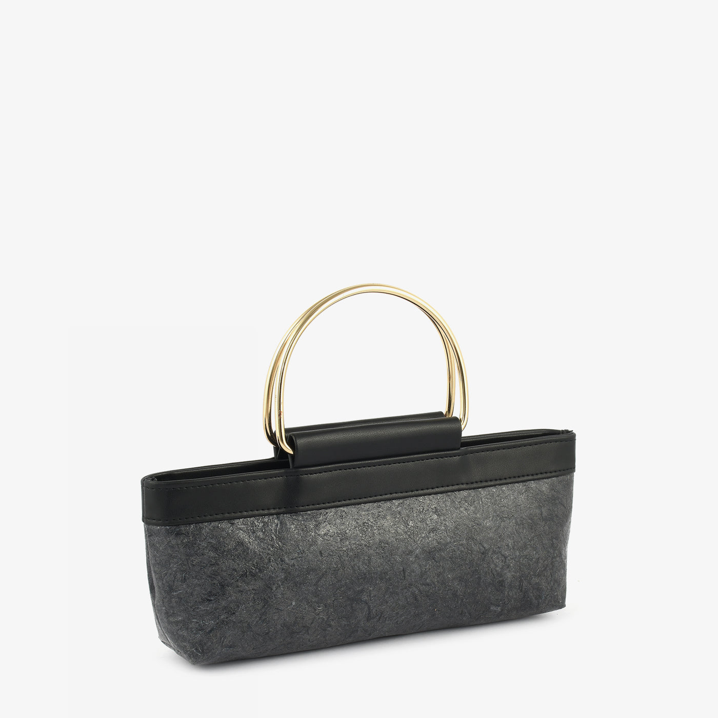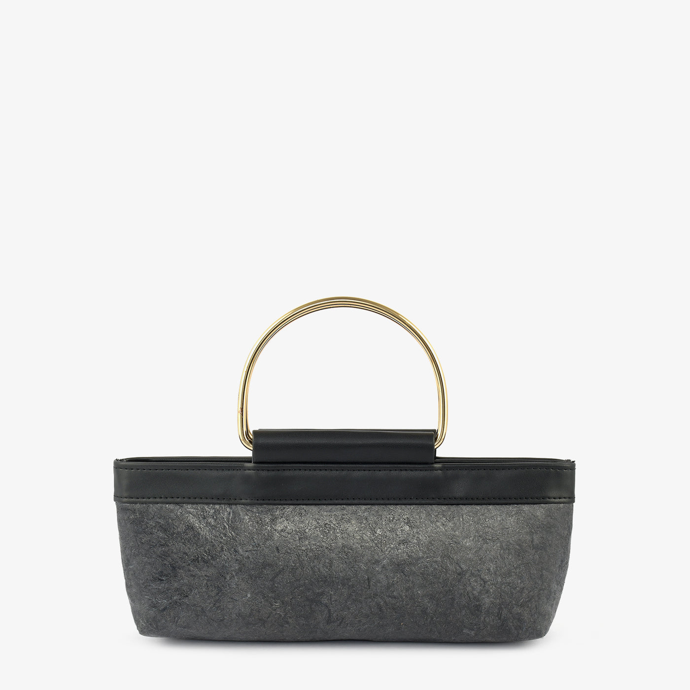 Carry your essentials in sustainable style with the "Eco-Chic Banana Leather Clutch." This unique grey clutch is crafted from eco-friendly banana leather and features sleek black trim and elegant gold-toned handles. Its compact design is perfect for adding a touch of modern sophistication to your evening look.