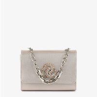 Carry a touch of modern glamour with the "Twilight Sparkle Chain Bag." This chic silver-toned bag features a subtle shimmer and a striking, jeweled heart-shaped embellishment at the center....
