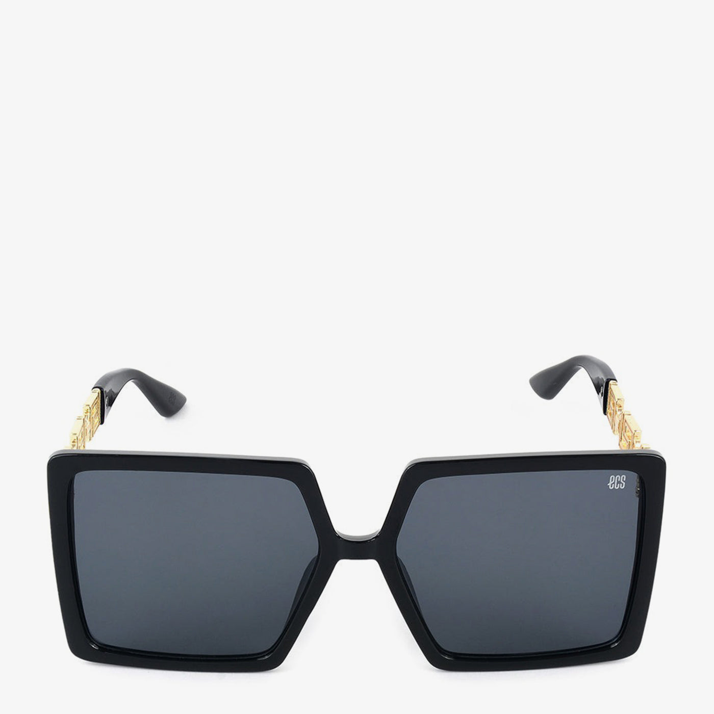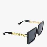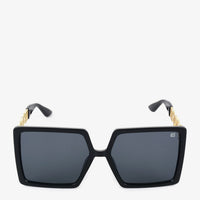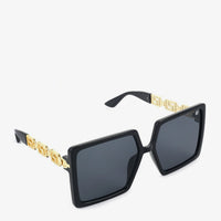 These bold black sunglasses feature an oversized square frame. The temples are embellished with a striking gold chain detail. A fashionable accessory to make a statement.