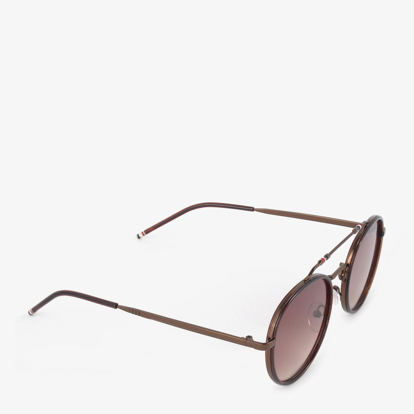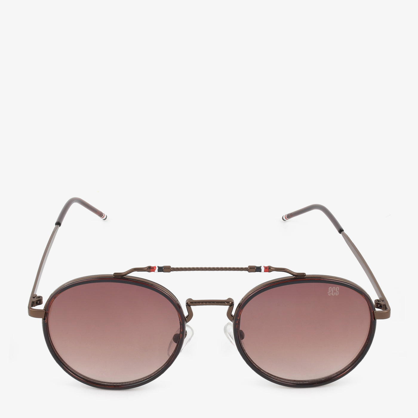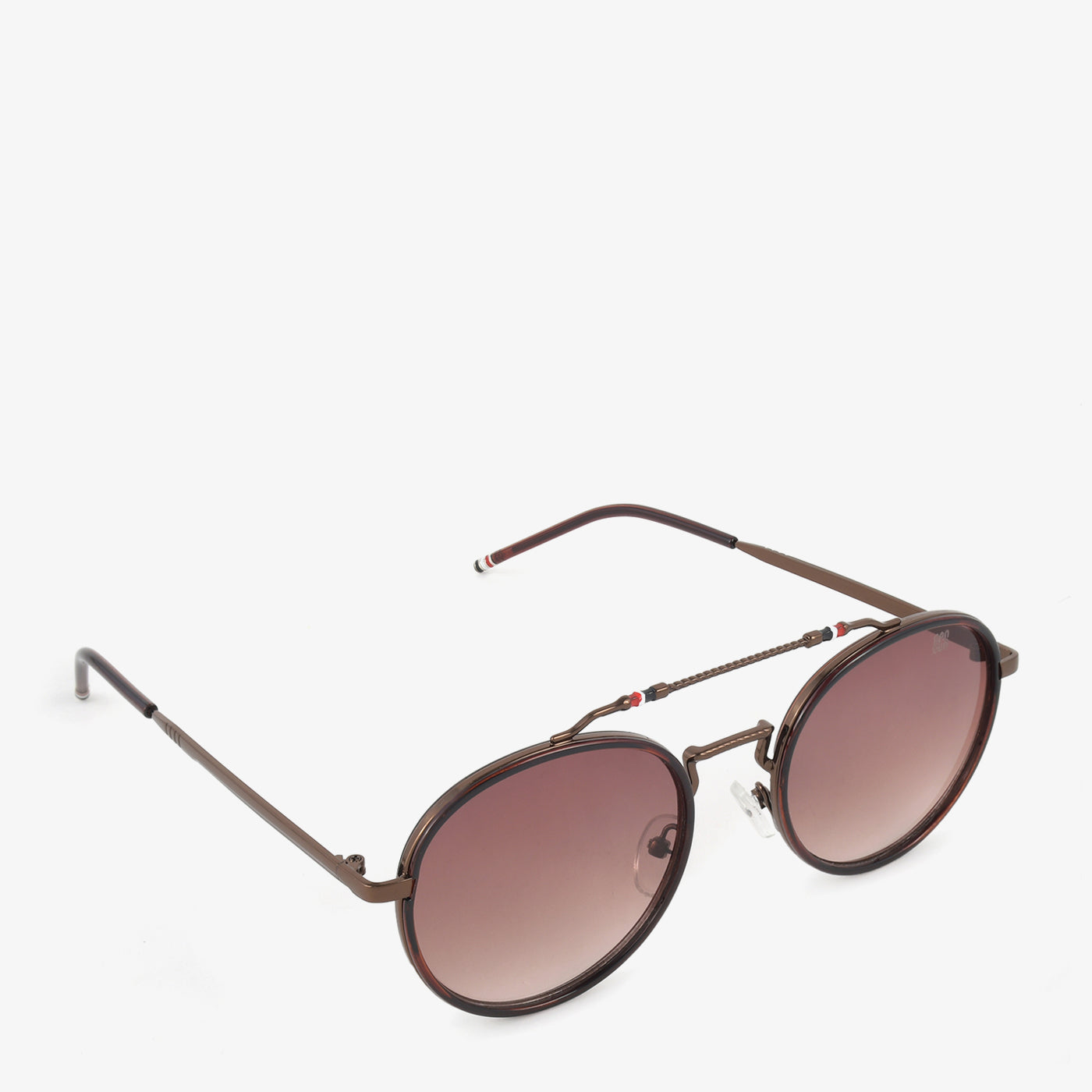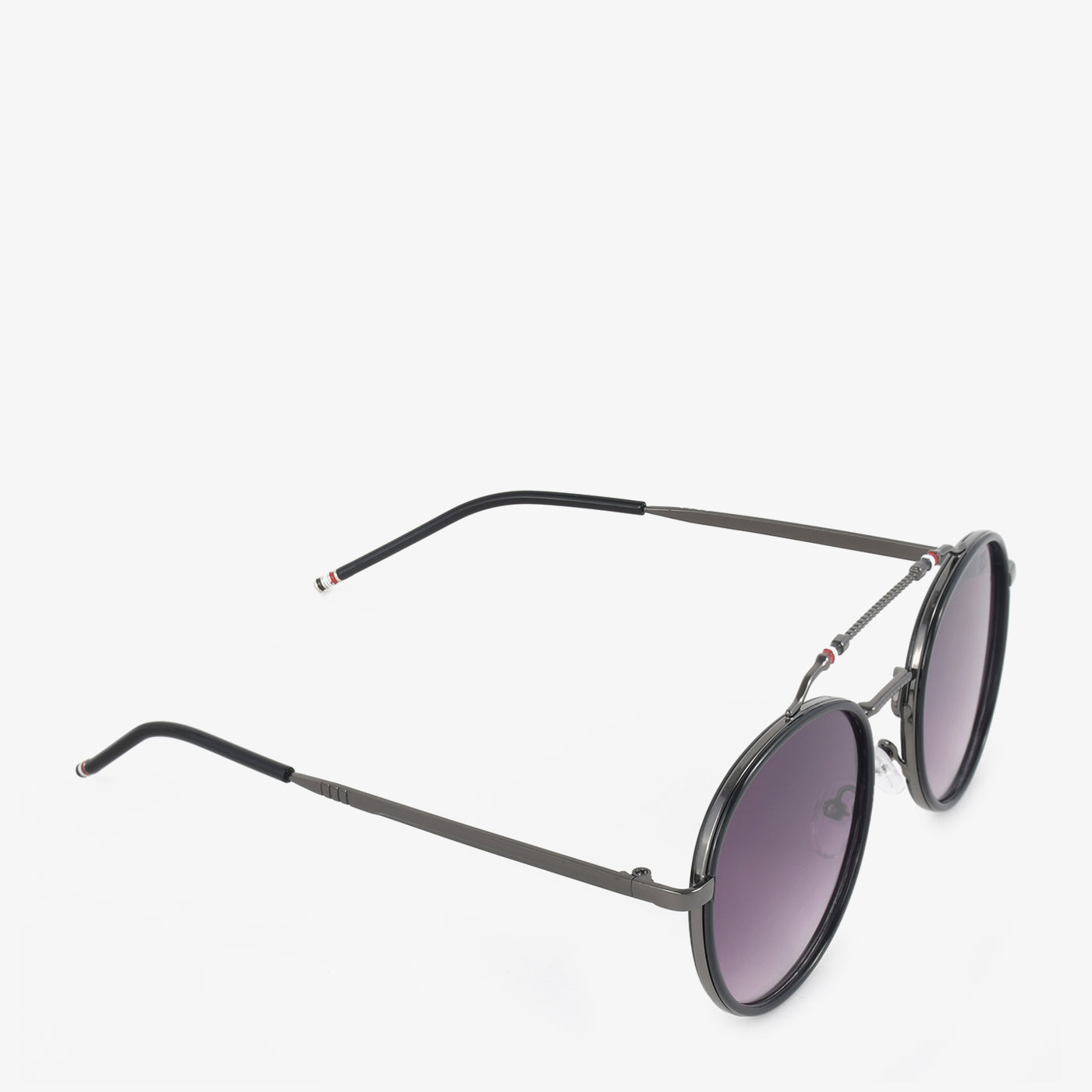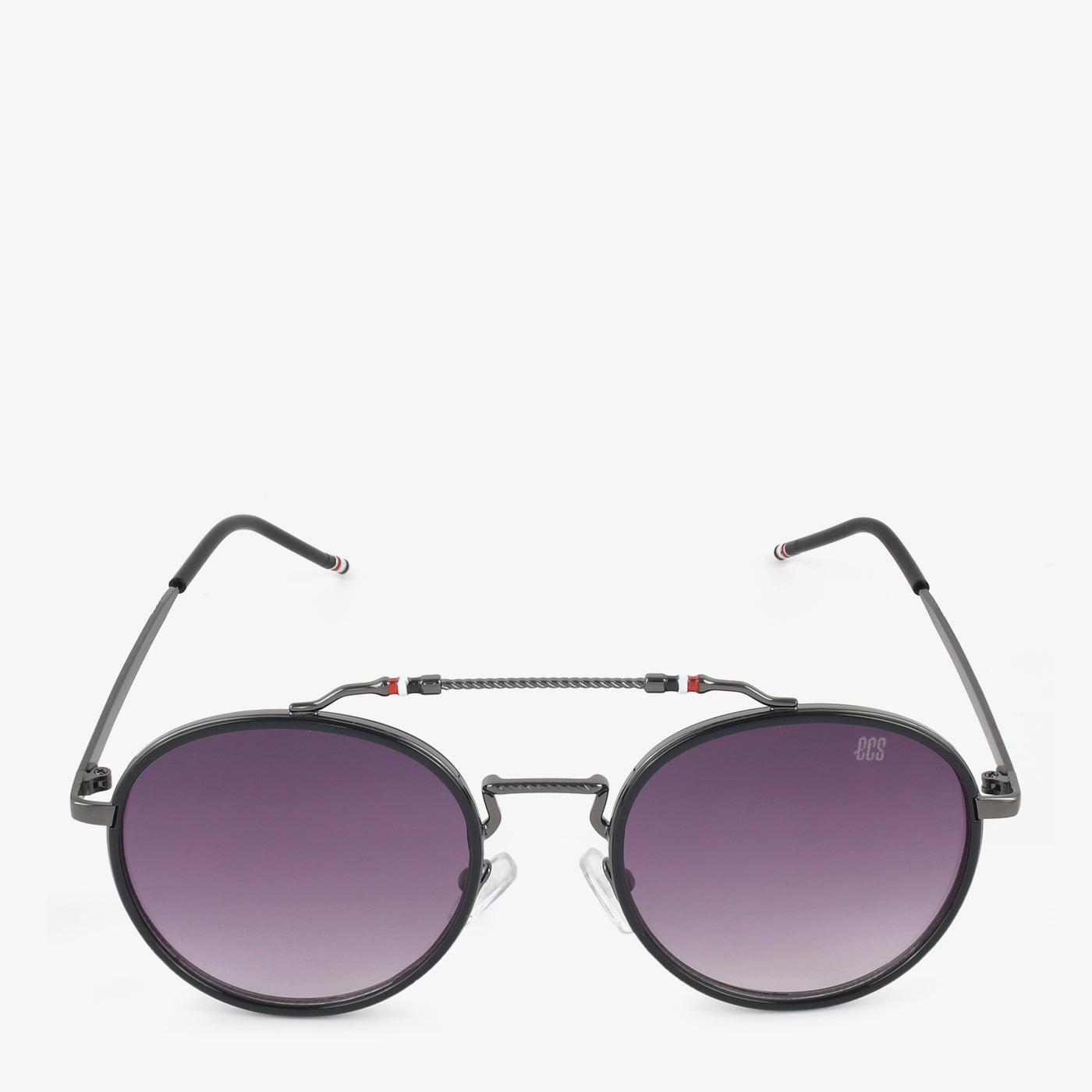 Embrace a touch of retro cool with these women's round sunglasses. They feature a full, dark metal frame and round lenses with a subtle purple gradient. A unique, connected double bridge adds a distinctive detail.