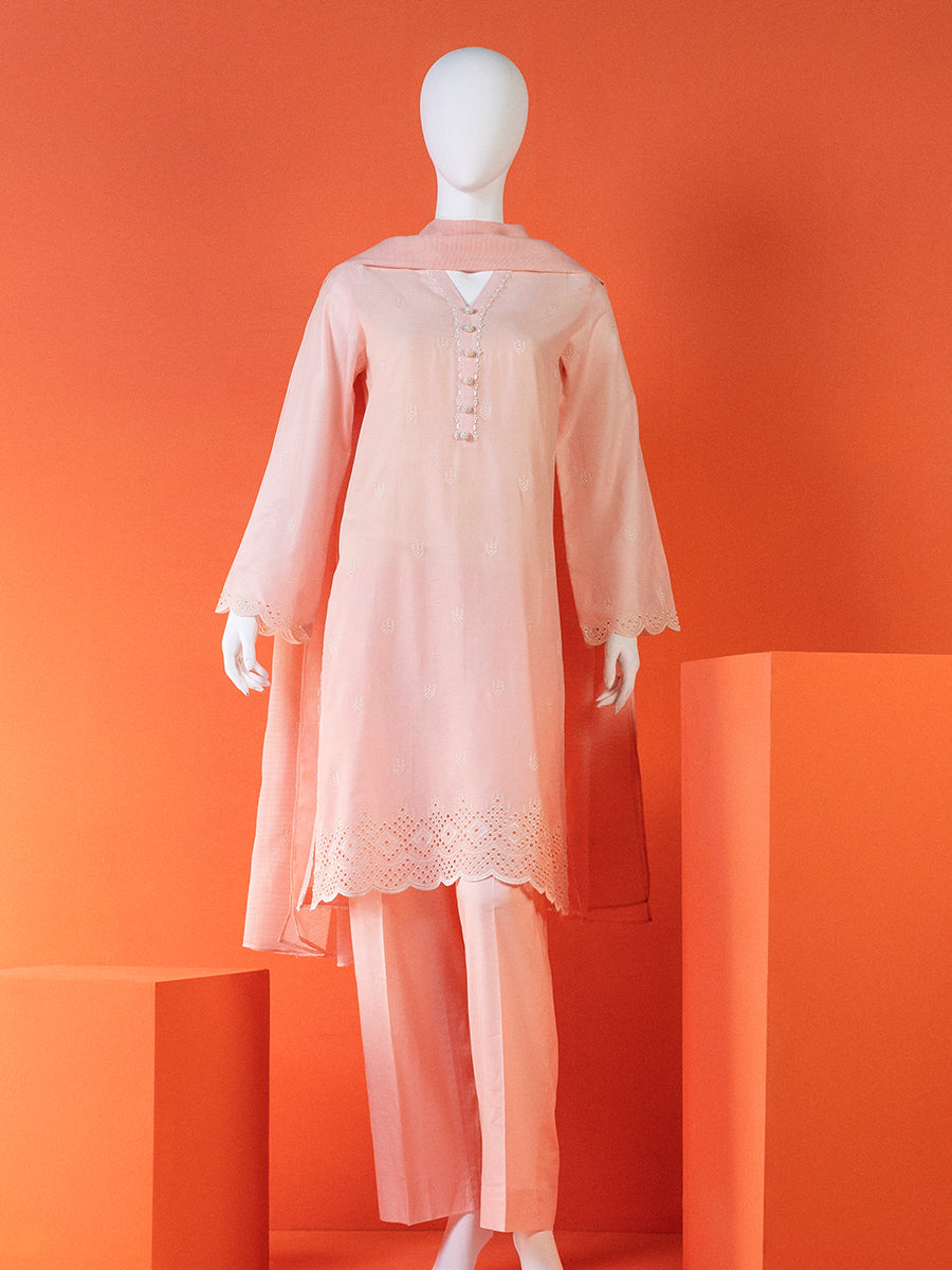 Presenting a gracefully coordinated women's 3-piece suit, perfect for a refined look. It features a versatile basic shirt crafted from light and breathable lawn fabric, complemented by sleek trousers made from comfortable cambric. A beautiful dupatta, fashioned from luxurious Monar fabric, completes this cohesive and stylish ensemble.