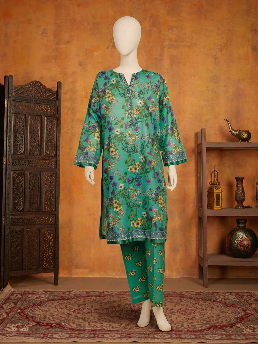 A vibrant two-piece outfit designed for effortless everyday elegance. The shirt is crafted from a premium lawn and cambric blend, offering a lightweight and breathable feel, paired with a matching cambric trouser for all-day comfort. The medium-length basic shirt provides a clean and modest silhouette, making it perfect for daily styling. The design features an intricate botanical motif scattered across the shirt, enhanced with detailed embellishment on the neckline and contrasting borders on the sleeves and hemline, while the trouser showcases a coordinated pattern that adds harmony and character.